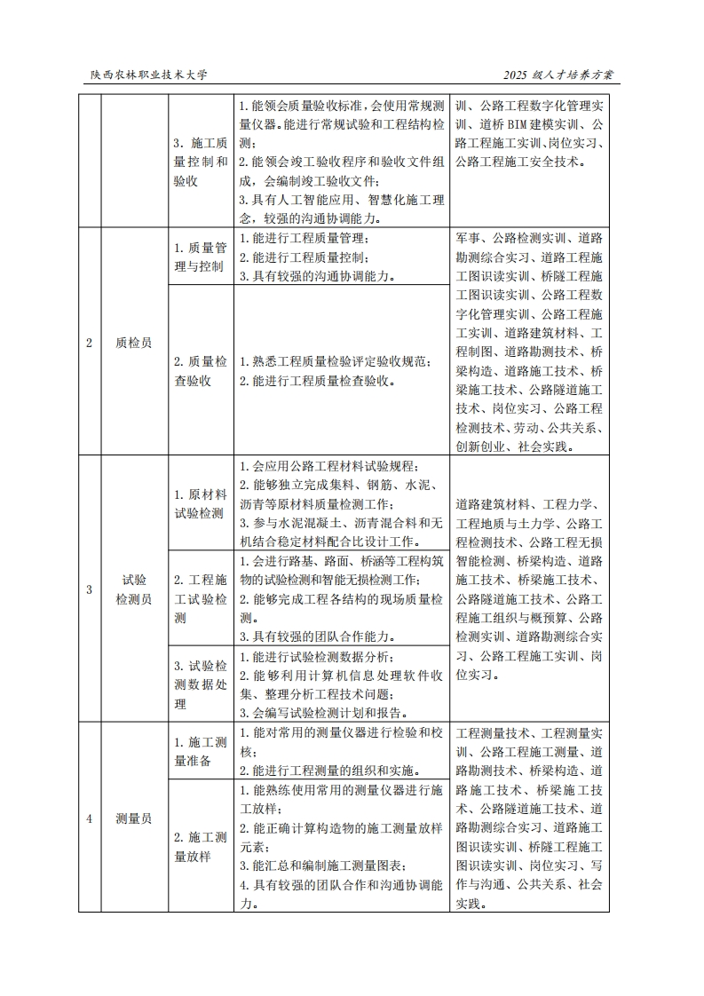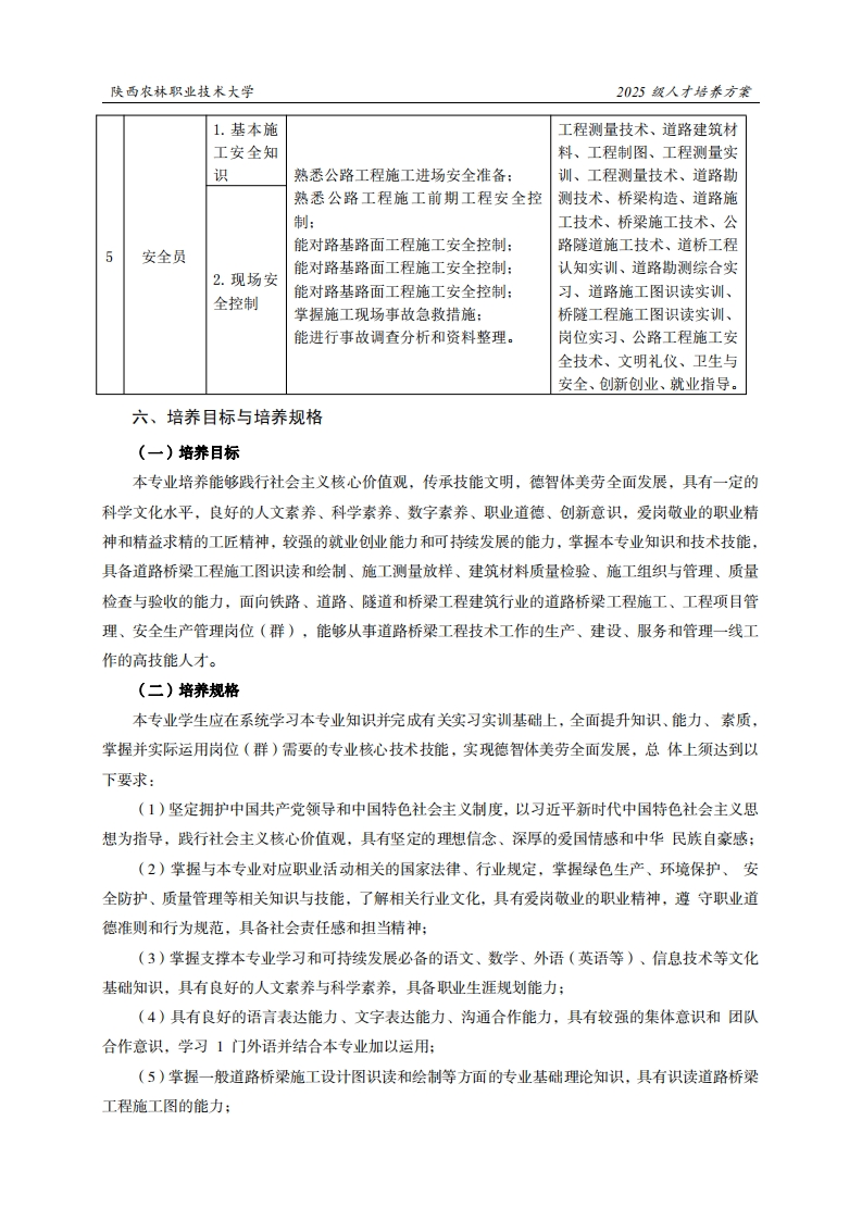 陕西农林职业技术大学2025级人才培养方案《道路与桥梁工程技术》专业人才培养方案(普通三年制)一、专业名称(专业代码)道路与桥梁工程技术(500201)二、入学基本要求招生对象:中等职业学校毕业、普通高级中学毕业或具备同等学力。招生类型:物理类。三、基本修业年限三年。四、职业面向所属专业大类(代码)A交通运输大类(50)所属专业类(代码)B道路运输类(5002)对应行业(代码)C铁路、道路、隧道和桥梁工程建筑(481)道路与桥梁工程技术人员(2-02-18-09)主要职业类别(代码)D项目管理工程技术人员(2-02-30-04)主要岗位(群)或技术领域举例E道路桥粱工程施工、工程项目管理、安全生产管理职业类证书举例F建筑信息模型(BIM)、路桥工程无损检测五、职业岗位与职业能力分析序典型工作号工作岗位任务职业能力支撑课程1.能正确识读道路桥梁工程施工设计军事、写作与沟通、工程测图,正确地向施工班组进行技术交底:量技术、工程力学、道路建2.能正确使用测量仪器进行施工测量筑材料、工程制图、CAD应1.施工前放样:用技术、BIM技术应用基础、期准备3.在工程师指导下,能正确编制施工组工程地质与土力学、结构设织设计,编制劳动力、材料、机械需用计原理、工程测量实训、道1施工员量计划。路勘测技术、桥梁构造、道1.领会施工工艺流程,能根据施工技术路施工技术、桥梁施工技术、规范指导施工作业:公路隧道施工技术、公路工2.施工过2.能使用网络图编制和调整施工进度程施工组织与概预算、道桥程管理计划:工程认知实训、道路勘测综3.能进行砌体砌筑、混凝土浇筑、钢筋合实习、道路施工图识读实加工绑扎等操作的施工组织作业。训、桥隧工程施工图识读实