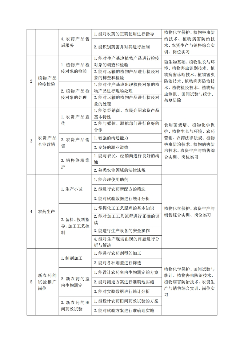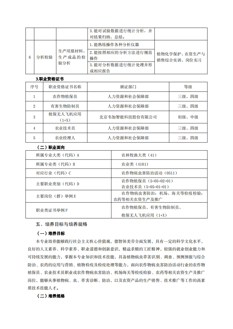 《植物保护与检疫技术》专业人才培养方案一、专业名称及代码专业名称:植物保护与检疫技术。专业代码:410106。二、入学要求招生对象:高中(中职)毕业生或具有同等学历者。招生类型:文理兼收。三、修业年限三年。四、职业面向(一)职业能力分析1.专业服务面向本专业毕业生主要面向植物检疫机构或基层植保服务体系,农业系统的各级农技中心、植保植检站、园艺站、果树站、蔬菜站;农药企业的生产、试验、销售部门;高等农业院校及科研单位的植保实验室;职业中学及农民技校;庄稼医院及植保经营实体;果、蔬、花卉及其它园林观赏植物种苗基地:城市植物园、公园及绿化公司:昆虫资源保护区及观赏昆虫开发公司等,从事科研、农药生产、使用、推销、农业植物保护和检疫等技术工作。2.职业岗位与职业能力分析余职业能力号工作岗位典型工作任务支撑课程1.具有健康的身体素质植物生长与环境、田间试验与统计、植物害虫识别技1.病虫草害田2.能进行调查数据的统计分析间调查测报术、植物病害诊断技术、植物病虫害防治基础综合实3.能进行病虫草害的田间调查训、岗位实习1.能总结当地常见作物病虫草害的农作物栽培、园艺植物栽发生规律培、杂草防除、植物化学保植保技术1护、植物害虫防治技术、植推广2.病虫草害防2.能进行当地常发病虫草害的综合治技术指导防治物病害防治技术、植物病虫害防治基础综合实训、植物3.能指导当地农作物、园艺、花卉病虫草害防治技术综合实栽培训、岗位实习1.能给经销商、农民讲解农药基础3.新农药产品知识植物化学保护、农资生产与推广销售综合实训、岗位实习2.能进行大田药效试验