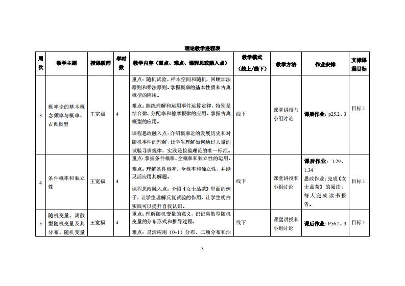 《概率论与数理统计》教学大纲课程名称:杯率论与煮理统计谋程类别(必体选修),专业必修课程英文名蒋:Probability Theory and Mathematical Statistics总学时m苹时/学分:56/3.5/3.5其中实验实瘦举时,0先修课程:高数学后续课程支撑应用峡计学,大数指分折授课时间:周五24节(2-17周)、周三910节(11-14周)授课地点:6302,6410视课对米:22多煤体1班,22工业设计1班,22经济金量2班,23第二学位班级开课学洗:粤合产业科技学陕任课妆师姓名家麻:王宽福/讲狮答凝时间、地点与方式:周三-周五14:30-17:30,线上容凝裸避核方式:开卷()闭卷(√)课程论文()其它()使用藏材:盛聚等,概幸论与数理统计(第5版),浙江大学出版社,2020-11-1妆学◆考资料:概率论与数理统计教程(第3版)茆诗松程依明濮晓龙,高等教育出版社2019.11概幸论与数理统计陈希需中国科技大学出版社2009年02月概幸论与数理统计辅导讲义李永乐王式安,西安交通大学出版社2020.03课是衡介概幸论与数理统计是高等院校理工类、经管类的重要课程之一。在考研数学中的比重大钓占2%左右。主要内容包括:概幸论的基本概念、随机变量