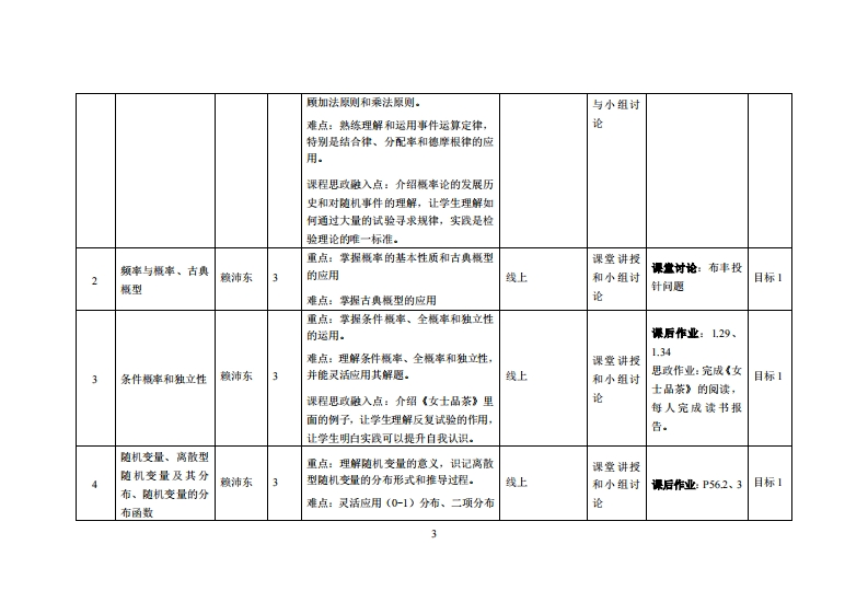 《概率论与数理统计》教学大纲课避名称,概幸率论与数理统计课和类别(必修选修),专业必修课程英文名称:Probability and statistics总学时周学时学分,56/3/3其中实险实液学时:先修课是:高等款学后续课程支嫌授课时间:星期一9-10节5-8周、星期一5-7节2-17周、星期提课地点:莞城6405、6312、6412三-10节11-14周、星期五2-4节2-17周授课对津:22计算机科学与技术专业(诗境电商)、22智能制造、22金敢2班开课学跳:博台产业科技学愧任裸救师姓名游:黄沛东饼师答果时间、地点与方式:线下:,时间::热上(通过撒值,心时联系)课程考核方式:开卷()闭卷(√)课程论文()其它()使用教材:盛聚等,概率论与数理统计(第5版),浙江大学出版社,2020-11-1妆学◆考资料:概率论与数理统计教程(第3版)茆诗松程依明濮晓龙,高等教育出版社2019.11概幸论与数理统计陈希霭中国科技大学出版社2009年02月概幸论与数理统计辅导讲义李永乐王式安,西安交通大学出版社220.03课度物介:概率论与数理统计是高等院校理工类、经管类的重要课程之一。在考研数学中的比重大钓占2%左右。主要内容包括:概率论的基本概念、随机变量及其概幸分布、数字特征、大数定律与中心极限定理、统计量及其概幸分布、参数估计和假设检验、回归分析、方差分析等内容。课避被学目标及对毕业买求州标点的支撑:(与人才将养方案中中业要求指推标点分解与课程支排矩阵”相一意:建议课程微学目标按章节来划分,年