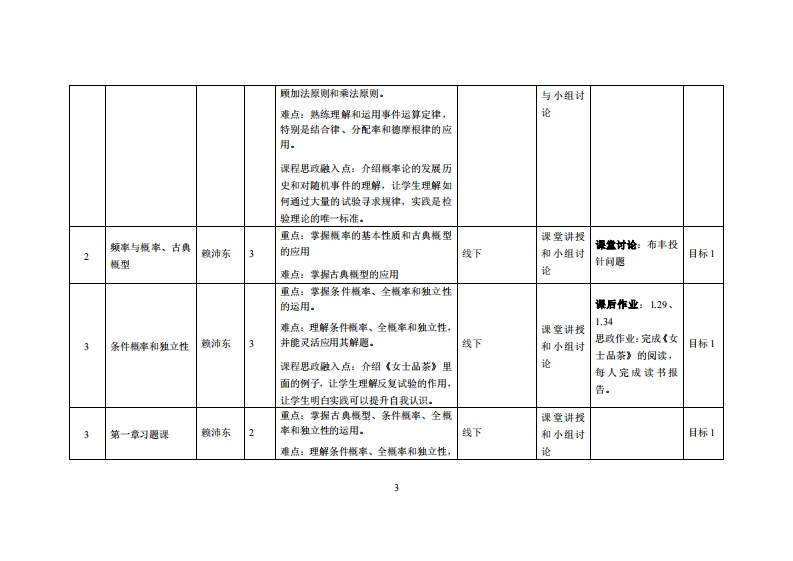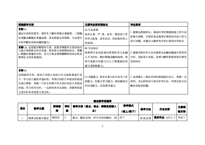(概率率论与数理统计》教学大纲课应名称:餐率率论与散道统计课和类别(必修选修),专业必修课程英文名称:Probability and statistics总学时周学时学分,56/3.5/35其中实险实液学时,0先修课是:高等款学后续课程支推计量经济学授课时间:周一57节(1-16周),周四910节(3-6周)授课地点:6411授课对津:23金数1班,23额工设1垂开课学陕:博台产业料技学陕在课妆师姓名京称:典莎末饼狮答是时间、地点与方式:线下:641山,时间:周一第五七节:换上(通过撒值,时联系)课程考楼方式,开卷()闭卷(√)课程论文()其它()使用被材盛聚等,概率论与数理统计(第5版),高等教有出版社,2023-05-10妆学考资料:概率论与数理统计教程(第3版)茆诗松程依明濮晓龙,高等教育出版社2019.11概幸论与数理统计陈希需中国科技大学出版社2009年02月概率论与数理统计辅导讲义李永乐王式安,西安交通大学出版社2020.03课程物介概幸论与数理统计是高等院校理工类、经管类的重要课程之一。在考研数学中的比重大约占22%左右。主要内容包括:概幸论的基本概念、随机变量及其概率分布、数字特征、大数定律与中心极限定理、统计量及其概幸分布、参数估计和假设检验、回归分析、方差分析等内容。课程被学目标及对单业要求指标点的支撑:(与人才培养方案中:中业要求指标点分解与裸程支神矩车”相一藏:建议课程数举目标按章节来划分,每个目标体现知识、能力和家质目标(正文中制除此度话,下同)