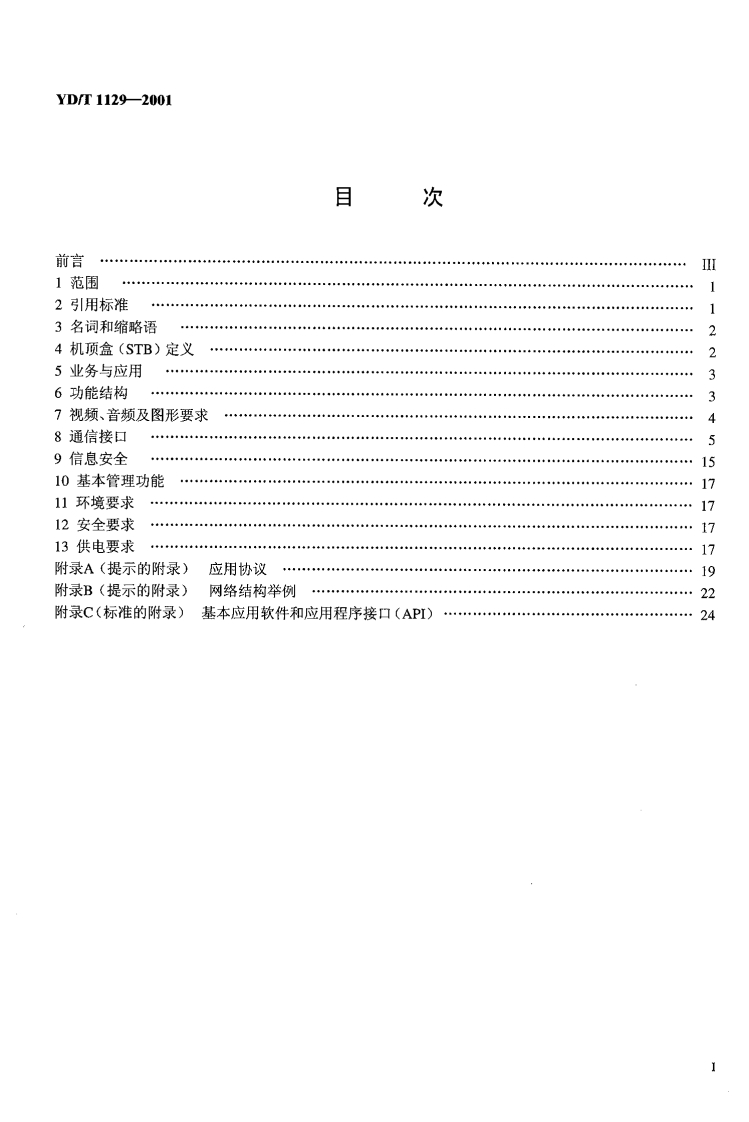 YD-T1129-2001348072@abc4个月前发布关注私信1.13MB27页034YD-T1129-2001此内容为付费资源,请付费后查看¥21¥31黄金会员免费钻石会员免费立即购买您当前未登录!建议登陆后购买,可保存购买订单付费资源 第1页 / 共27页 第2页 / 共27页 试读已结束,还剩25页,您可下载完整版后进行离线阅读 THE END标准规范 文本预览 YD中华人民共和国通信行业标准YD/T1129一2001适用于电信网网络环境的机顶盒(STB)技术要求Technical Specification of Set-Top-Box(STB)in Telecommunications Networks2001.05-25发布2001-11-01实施中华人民共和国信息产业部发布 查看更多 收起部分 喜欢就支持一下吧收藏