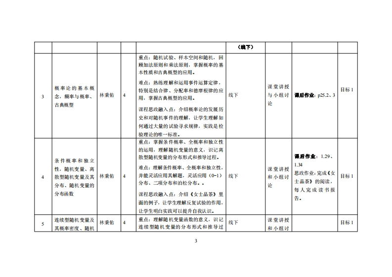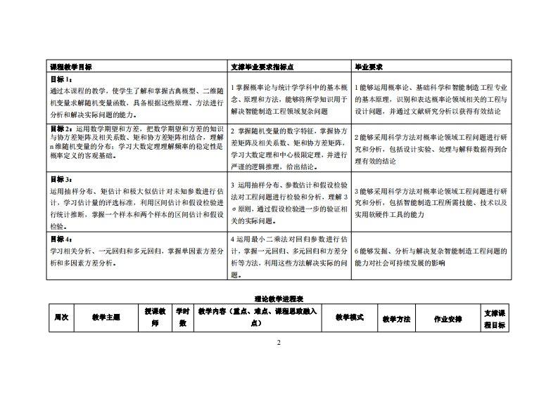 《概率论与数理统计》教学大纲课程名称:餐率论与数理统计课程类别(必修选修),专业必修课程英文名称:Probability Theory and Mathematical Statistics总学时周学时/学分,56/3.5/3.5其中实险实我学时:0先修课程:高等兼举后续课程支撑:应用桃计学授课时间:周一1-2节(3-16),周三1-2节(3-16)提裸地点:实验接315授裸对津:21金数1班(科技),21金数2班(管)、21智能制造1、2班开课学佛:粤台产业科技学陕任裸课收师挺名/职路:林乘佑副做授答聚时间、地点与方式:线下:645,时间:周一算12节,周三第12节,0fmce裸程考核方式:开卷()闭港(√)课程论文()其它()使用做材:盛聚等,概率论与数理统计(第5版),浙江大学出版社,2020-11-1收学事考资料:概率论与数理统计教程(第3版)茆诗松程依明濮晓龙,高等教有出版社2019.11概率论与数理统计陈希霜中国科技大学出版社2009年02月概率论与数理统计辅导讲义李永乐王式安,西安交通大学出版社2020.03课程简介:概率论与数理统计是高等院校理工类、经管类的重要课程之一。在考研数学中的比重大钓占22%左右。主要内容包括:概率论的基本概念、随机变量及其概幸分布、数字特征、大数定律与中心极限定理、统计量及其概率分布、参数估计和假设检验、回归分析、方差分析等内容。课程收学目标及对毕业要求指标点的支排:(与人才培养方案中“毕业要求指标点分解课程支排矩阵”相一敷:建议课程收苹目标按章节来划分,每个目标体现知识、能力和素质目标(正文中除此段语,下同)