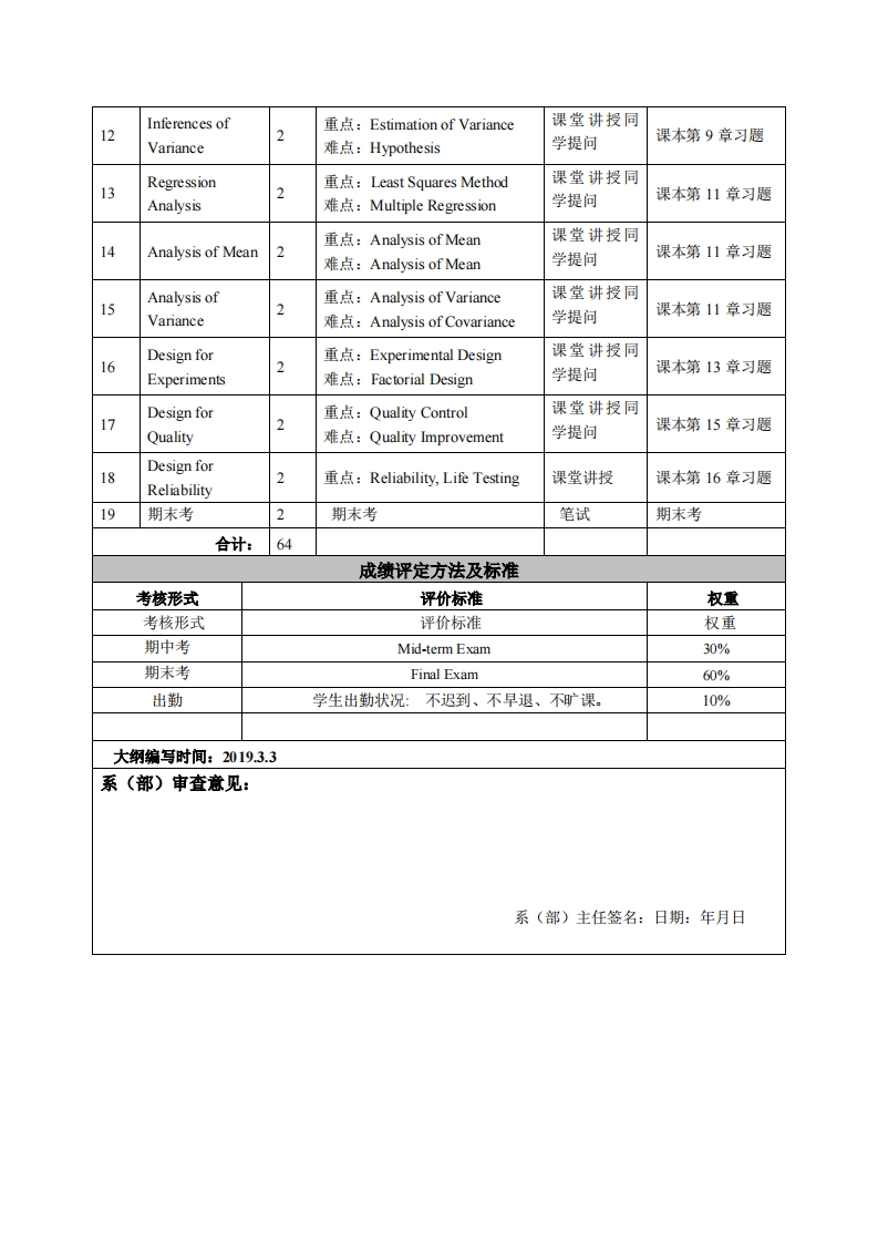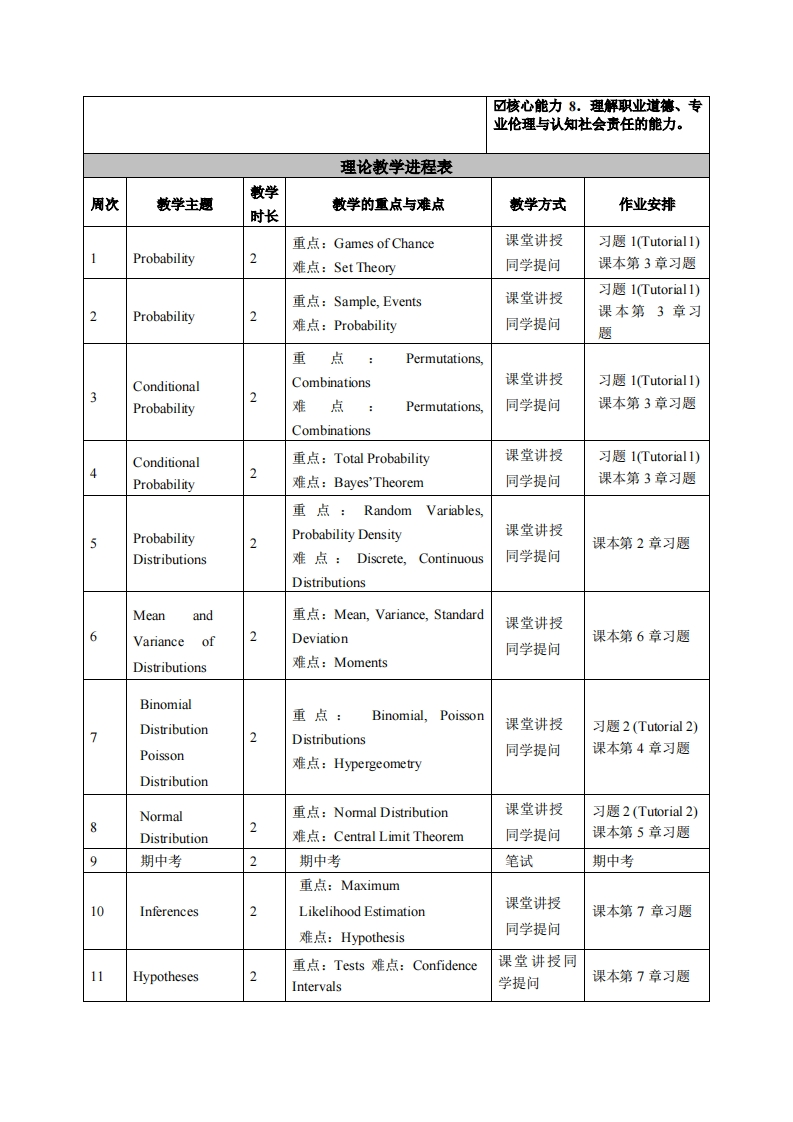 《概率论与数理统计》课程教学大纲课程名称:概率论与数理统计课程类别(必修/选修):必修课程英文名称:Probability and Statistics总学时/周学时/学分:36/2/2其中实验/实践学时:无先修课程:高中数学授课时间:星期一1-2节授课地点:实305授课对象:机械系二年级本科生开课院系:粤台学院任课教师姓名职称:何友达副敏授答疑时间、地点与方式:星期一与星期四34节,实214课程考核方式:开卷()闭卷()课程论文()其它()使用教材:概率论与数理统计(第九版)Probability and Statistics for Engineers(9 th Edition)Richard A.Johnson教学参考资料:无课程简介:机械系领域使用概率论与数理统计变成不可或缺。本课程洒盖的正是非常重要的一环,就是概率Probability,)概率分布(Probability Distributions),概率密度Probability Densities,)采样分布(Sampling Distributions),推理nferences)以及统计学的工程应用(Applications)。对其理论循序渐进地讲解并用许多范例来帮助理解。课程数学目标本课程与学生核心能力培养之间本课程的主要目标就是介绍概率学,统计学,推理,因为理的关联授课对象为理工科专业学论稍嫌艰辛,因此用许多时间以范例协助理解。生的课程填写此栏):学习方法:☑核心能力1.应用数学、基础科学和机械设计制造及其自动化专业1、课堂上讲解知识能力;2、同学提问口核心能力2.设计与执行机械设3、同学回家作业练习计制造及其自动化专业相关实验,以及分析与解释相关数据的能力:4、藉考试☑核心能力3.机械工程领域所需技能、技术以及实用软硬件工具的能力;口核心能力4.机械工程系统、零部件或工艺流程的设计能力;口核心能力5.项目管理、有效沟通协调、团队合作及创新能力:☑核心能力6.发掘、分析与解决复杂机械工程问题的能力:☑核心能力7.认识科技发展现状与趋势,了解工程技术对环境、社会及全球的影响,并培养持续学习的习惯与能力: