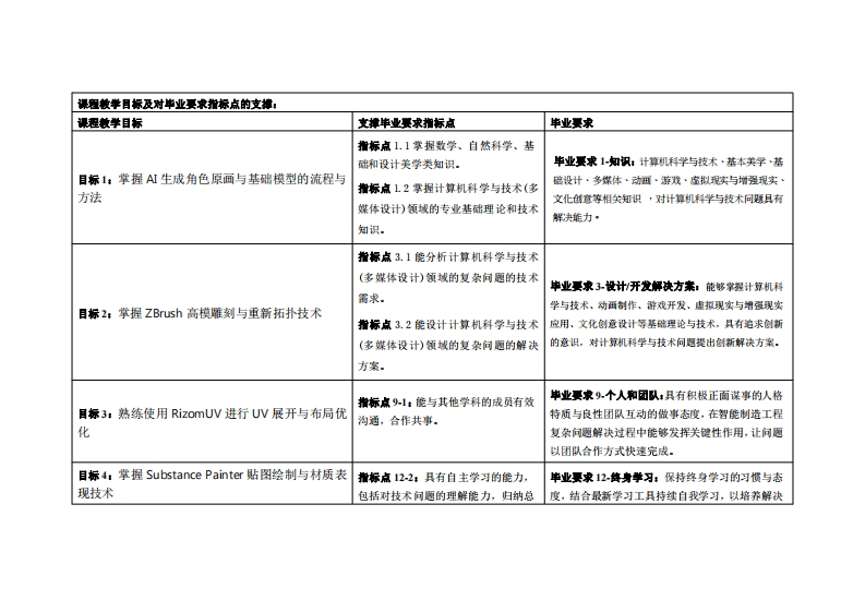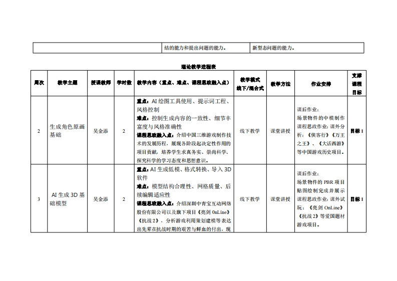 《棋型设计与实作》教学大纲裸程名称:模型设计与实作课程类别(必修选修),选修课程英文名称:Model Design and Implementation总学时周学时/学分,3222其中实险实我学时:016先售课是:数字图像处理与数字绘图后续课程支撑:游戏设计·项目化课程、虚拟现实与扩增实境、专题制作·多媒体项目实作授课时间:2至17周星期二5-6节提课地点:实616机房提课对津:2024多媒体1班开课学洗:粤台产业科技学院任课敏即姓名/职淋:吴金添容疑时间、地点与方式:1每次课的课前、课间和课后,采用一对一的问答方式2每次习题课,采用集中讲解方式.课是考核方式:开卷()闭卷()课程论文《)其它(√)非试卷类报告使用材:《3山sMax2023实训教程》,周贤,人民邮电出版社,1SBN:9787115617941课程介:本课程围绕现代三维角色设计与制作流程,结合AI生成技术与专业软件进行教学。学生将学习使用AI工具生成角色原画与基础模型,掌握ZBrush进行高模雕刻与拓扑优化,使用RizomUV进行UV展开,并利用Substance Painter进行贴图绘制与材质表现,最终完成可用于游戏或动画的高质量角色模型。