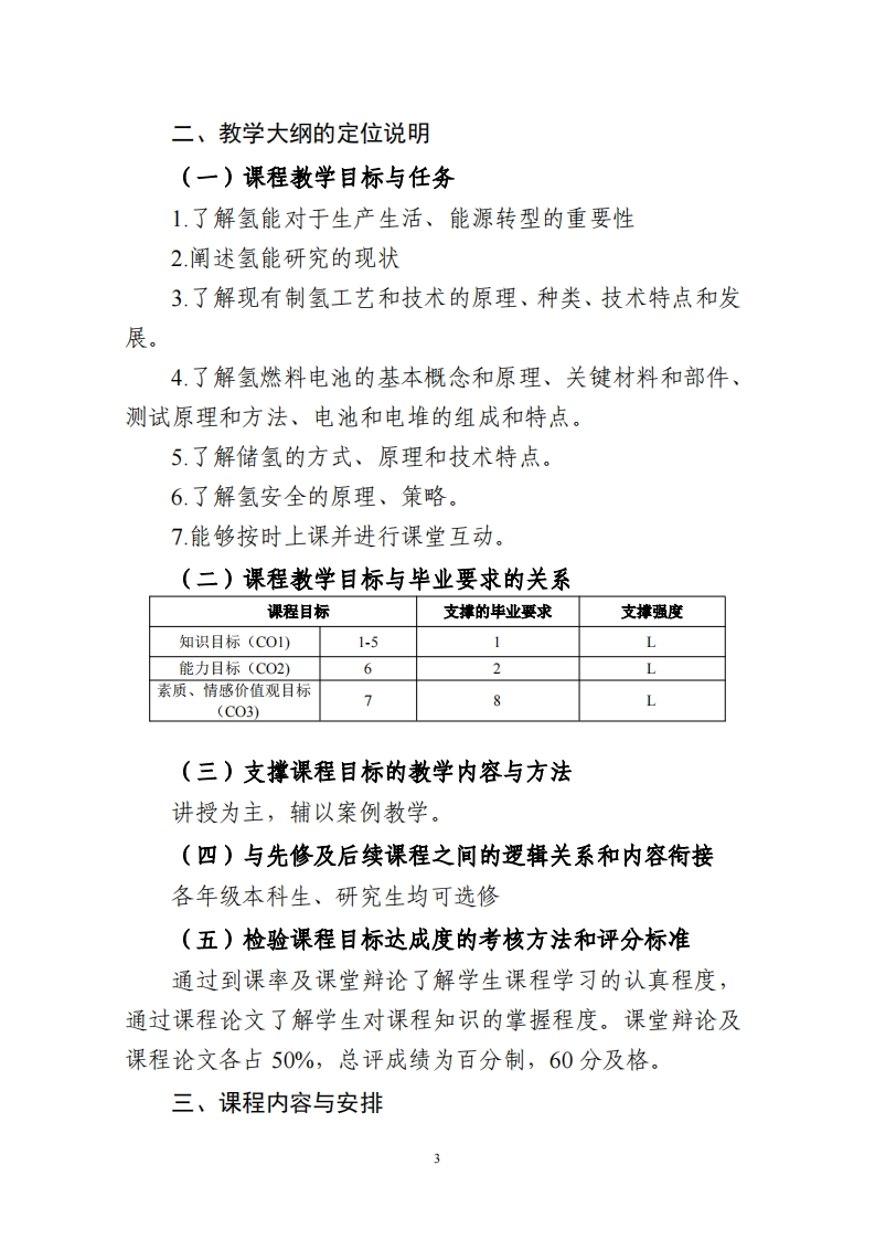 《氢能技术原理与应用》课程教学大纲一、课程概况课程名称氢能技术原理与应用课程号107412031课程英文名称The Principle and Application ofHydrogen Technology学时/学分36/2课程性质选修适用专业新能源材料与器件专业课程负责人徐英教学团队李涛选用散材及张辉、毛宗强、衣宝廉等,《氢能利用关键技术系列》,第一版,化学工业出版社,2021参考书目年课程简介:氢能是清洁的可持续能源,是世界能源转型发展的重要方向。氢在地球上主要以化合态的形式出现,是宇宙中分布最广泛的物质,它构成了宇宙质量的75%。氢的制取、储存、运输、应用技术也将成为21世纪能源科学备受关注的焦点。本课程系统介绍制氢工艺和技术、氢燃料电池、氢气储运和氢安全,为本科生全面学习了解氢能相关的基本知识提供课程平台。课程目标(Course Objectives,CO)知识目标(C01)了解氢能的特点、利用和开发方式,掌握氢能的发展方向能力目标(C02)了解氢科学中的物理化学、材料学、工程学相关的基本概念和知识、氢科学中的关键问题和己有的解决途径。素质、情感价值观目标(CO3)为后续专业课学习、科学研究、工程实践奠定坚实的理论基础☑PM1讲授法教学24学时67%口M2研讨式学习学时%教学方式(Pedagogical☑PM3案例教学12学时33%口PM4翻转课堂学时%Methods.PM)口PM5混合式教学学时%口M6体验式学习学时%oEM1课程作业试课%oEM2单元测试%oEMB课堂辩论%oEM6撰写论文/选oEM4期中考试%EM5期末考试%实验报告号考核方式考(Evaluation查oEM1课程作业%oEM2单元测试%☑EM3课堂辩论60%Methods.EM)必oEM4期末考试%☑EM5撰写论文/实验报告40%自选oEM10课堂互动%OEMI1实验%OEM12实训%