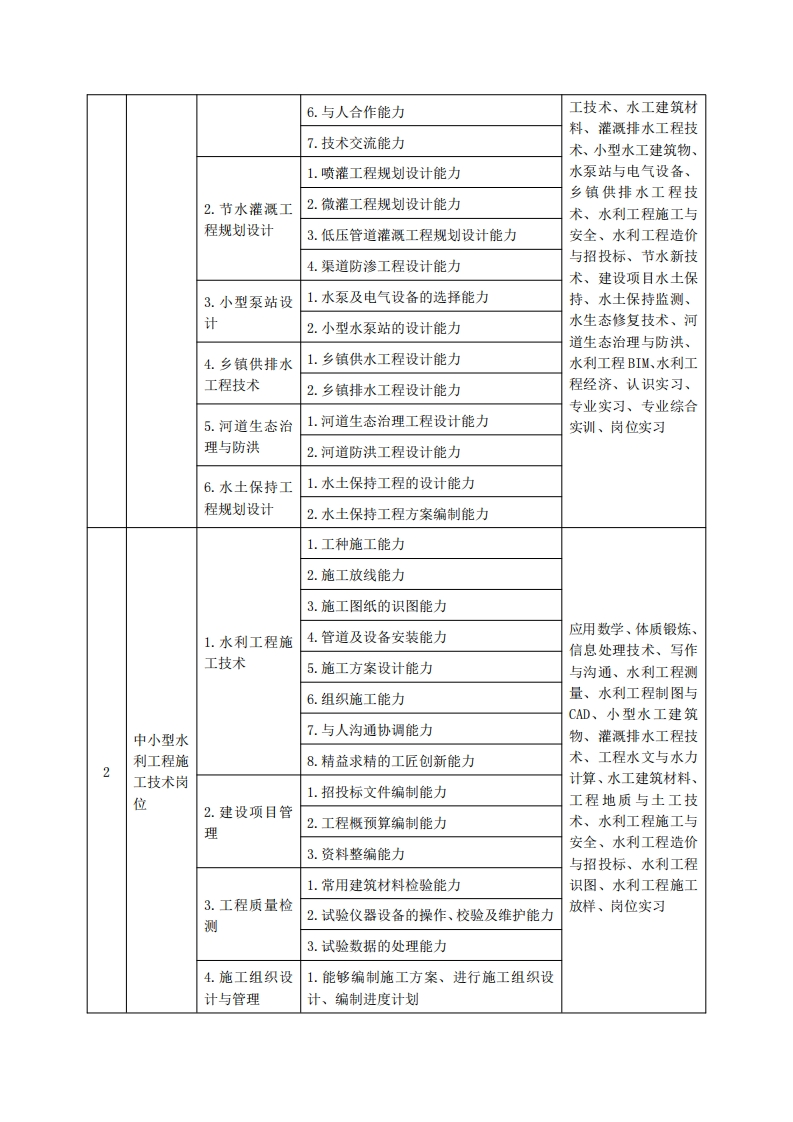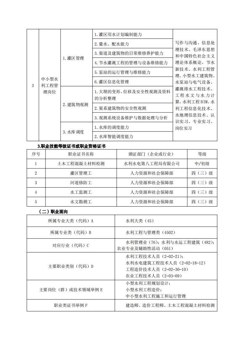 《水利工程》专业人才培养方案一、专业名称及代码专业名称:水利工程专业代码:450201二、入学要求招生对象:高中(中职)毕业生或具有同等学力者。招生类型:理科。三、修业年限三年。四、职业面向(一)职业能力分析1.专业服务面向本专业毕业生主要面向县级水务局(水利局)、小型水利工程设计公司、各级灌区管理单位、中小型水利工程施工企业,从事农田灌排、节水灌溉、河道生态治理、乡镇供排水、水土保持等水利工程规划设计、施工、运行管理工作。(1)面向的主要技术岗位有:①小型水利工程勘测设计岗位(设计员、技术员、测量员、资料员):②中小型水利工程施工技术岗位(施工员、技术员、测量员、质量员、试验员、资料员):③中小型水利工程管理岗位(监理员、技术员、资料员)。(2)面向的次要技术岗位有:①工程运行管理岗位(技术员、工程运行调度及维护人员):②土建行业施工岗位(施工员、质量员、资料员、测量员等。2.职业岗位与职业能力分析序工作岗位典型工作任务支撑课程号职业能力1.小型灌区规划能力应用数学、体质锻炼、信息处理技术、写作小型水利2.灌排渠系建筑物设计能力与沟通、水利工程测1.小型灌排工1工程勘测3.灌排系统设计能力量、水利工程制图与设计岗位程规划设计CAD、工程力学与结4.小型枢纽工程规划设计能力构、工程水文与水力5.田间工程设计能力计算、工程地质与土