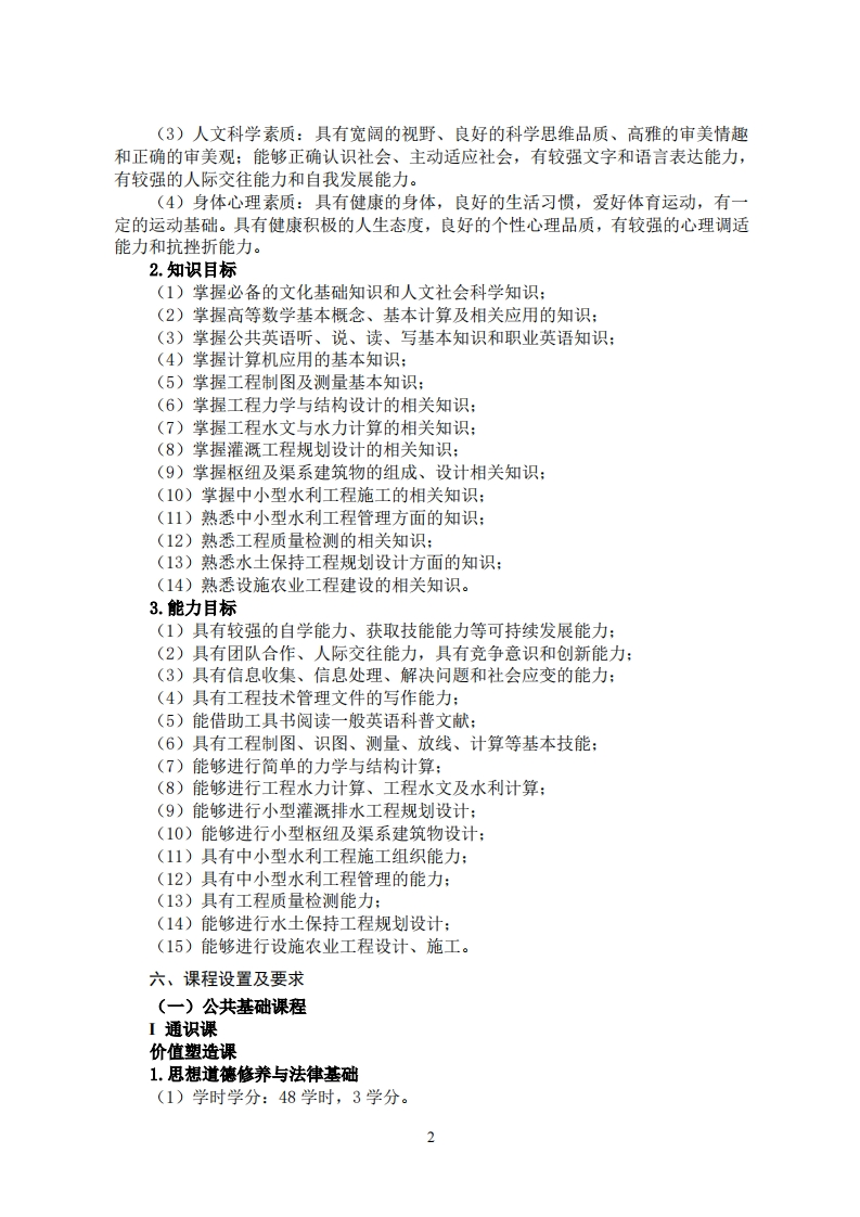 水利工程专业人才培养方案一、专业名称及代码专业名称:水利工程专业代码:450201二、入学要求高中毕业生及同等学力毕业生三、修业年限三年四、职业面向所属专所属业大类专业类对应行业主要职业类别主要岗位群职业资格证书(代码)(代码)(代码)(代码)或技术领域举和职业技能等例级证书举例水利农业工程技术人员土木工程混凝管理业(2-03-09-00):小型水利工程水利工程管理工程规划设计:土材料检测:水利水利工程(76):技术人员:地表水(河湖中小型水利工大类与管理类农业专业程施工:库湾)水质监(45)(4502)及辅助性(2-02-21-03):测:活动水利水电建筑工程中小型水利工技术人员工程造价数字程管理(051)化应用(2-02-21-09)五、培养目标与培养规格(一)培养目标本专业培养理想信念坚定,德、智、体、美、劳全面发展,具有一定的科学文化水平,良好的人文素养、职业道德、劳动精神和创新意识,精益求精的工匠精神,较强的就业能力和可持续发展的能力、热爱水利事业,掌握小型水利工程规划设计,中小型水利工程施工、管理等方面的专业基础理论知识,具备小型水利工程规划设计,中小型水利工程施工、管理能力,在水利行业从事农田水利、节水灌溉、水土保持、设施农业工程等小型水利工程规划设计和中小型水利工程施工、管理一线工作的高素质技术技能人才。(二)培养规格1.素质目标(1)思想政治素质:拥护党的基本路线,具有坚定正确的政治方向:掌握毛泽东思想、邓小平理论、“三个代表”重要思想、科学发展观和习近平新时代中国特色社会主义思想:具有正确的世界观、人生观和价值观,具有良好的诚信品质、敬业精神、责任意识、团队意识和诚信意识,恪守公民基本道德规范。(2)职业素质:具有良好的职业安全、环境保护意识、职业道德,工匠精神、创新精神、创业意识,能够立足生产、建设、管理、服务一线,踏实进取,敬业奉献,善于合作,敢于竞争,勇于创新。