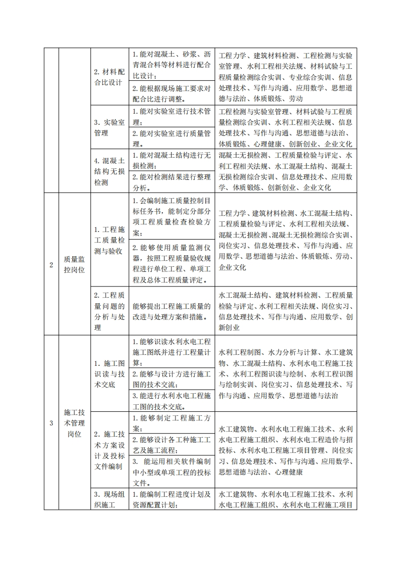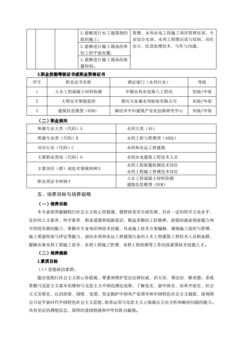 《水利水电工程技术》专业人才培养方案一、专业名称及代码专业名称:水利水电工程技术专业代码:450203二、入学要求招生对象:高中(中职)毕业生或具有同等学力者。招生类型:文理兼收。三、修业年限三年。四、职业面向(一)职业能力分析1.专业服务面向经过行业企业需求调研以及开设该专业相关院校毕业生的调研,大部分的毕业生就业于水利水电工程试验检测单位,其余小部分毕业生就业于土木建筑工程相关试验检测单位、水利水电工程施工单位及其他单位。(1)面向的主要技术岗位有:①试验检测岗位(试验员、材料员、检测员);②质量监控岗位(质检员、资料员);③施工技术管理岗位(施工员、技术员、资料员)。(2)面向次要技术岗位有:①土建行业施工岗位(施工员、质量员、资料员、测量员等:②工程运行管理岗位(技术员、工程运行调度及维护人员)。2.职业岗位与职业能力分析序工作典型工作号岗位职业能力支撑课程任务1.能编制材料试验检测方案:工程力学、建筑材料检测、工程检测与实验2.能在现场对原材料进行室管理、土工技术、混凝土无损检测、水利1.原材料试验检取样:1及半成品工程相关法规、信息处理技术、写作与沟通、测岗位检测3.能独立完成原材料及半应用数学、思想道德与法治、毛泽东思想和成品的常规指标检测:中国特色社会主义理论体系概论、体质锻炼、4.能对检测数据进行处应用英语、劳动理。