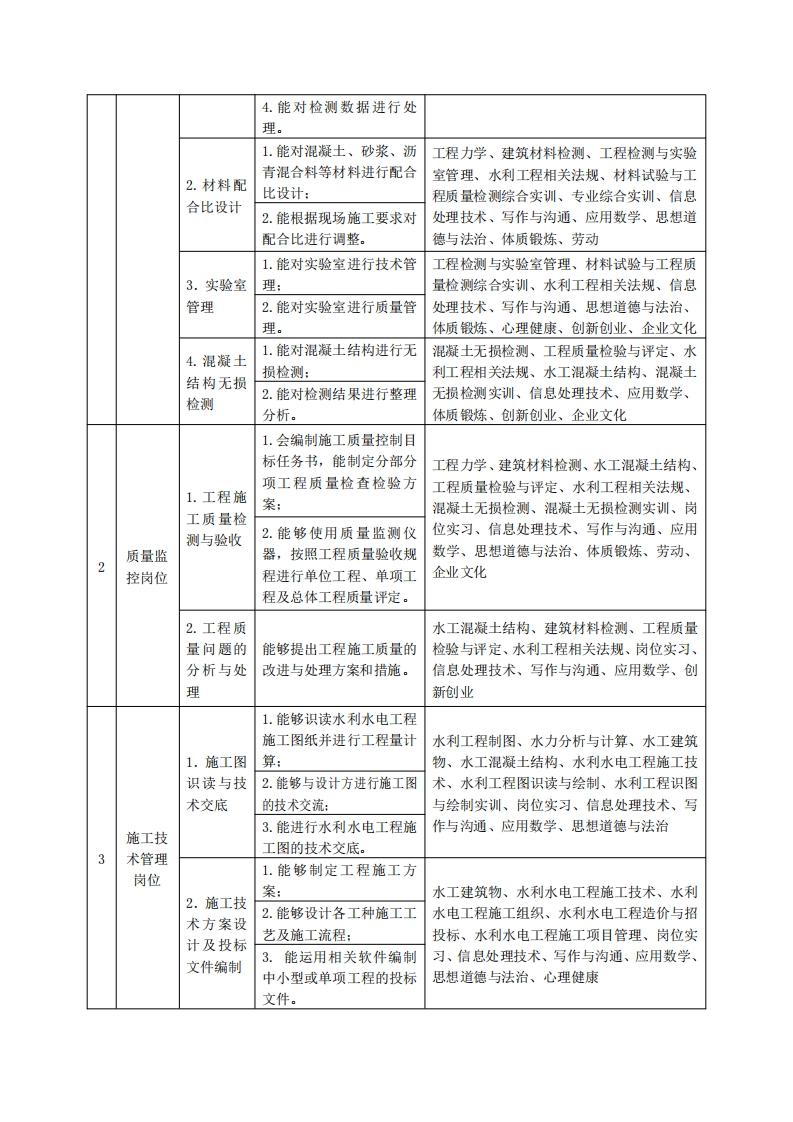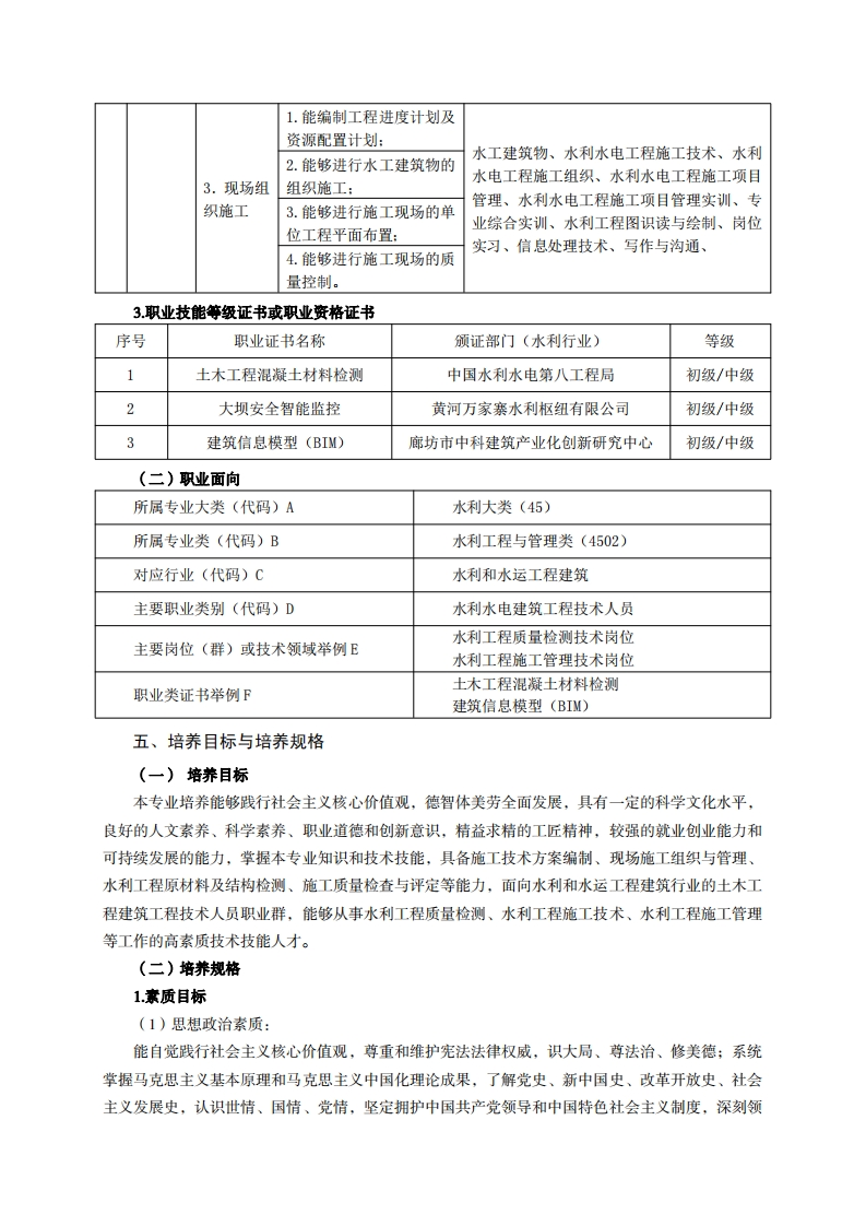 《水利水电工程技术》专业人才培养方案一、专业名称及代码专业名称:水利水电工程技术专业代码:450203二、入学要求招生对象:高中(中职)毕业生或具有同等学力者。招生类型:文理兼收。三、修业年限三年。四、职业面向(一)职业能力分析1.专业服务面向经过行业企业需求调研以及开设该专业相关院校毕业生的调研,大部分的毕业生就业于水利水电工程试验检测、质量监控及施工技术管理单位,其余小部分毕业生就业于土木建筑工程相关试验检测单位、水利水电工程监理单位及其他单位。(1)面向的主要技术岗位有:①试验检测岗位(试验员、材料员、检测员);②质量监控岗位(质检员、资料员);③施工技术管理岗位(施工员、技术员、资料员)。(2)面向次要技术岗位有:①土建行业施工岗位(施工员、质量员、资料员、测量员等:②工程运行管理岗位(技术员、工程运行调度及维护人员)。2.职业岗位与职业能力分析序工作典型工作号职业能力支撑课程岗位任务1.能编制材料试验检测方工程力学、建筑材料检测、工程检测与实验案:室管理、土工技术、混凝土无损检测、水利试验检1.原材料工程相关法规、信息处理技术、写作与沟通、及半成品2.能在现场对原材料进行测岗位检测取样:应用数学、思想道德与法治、毛泽东思想和3.能独立完成原材料及半中国特色社会主义理论体系概论、体质锻炼、成品的常规指标检测:应用英语、劳动