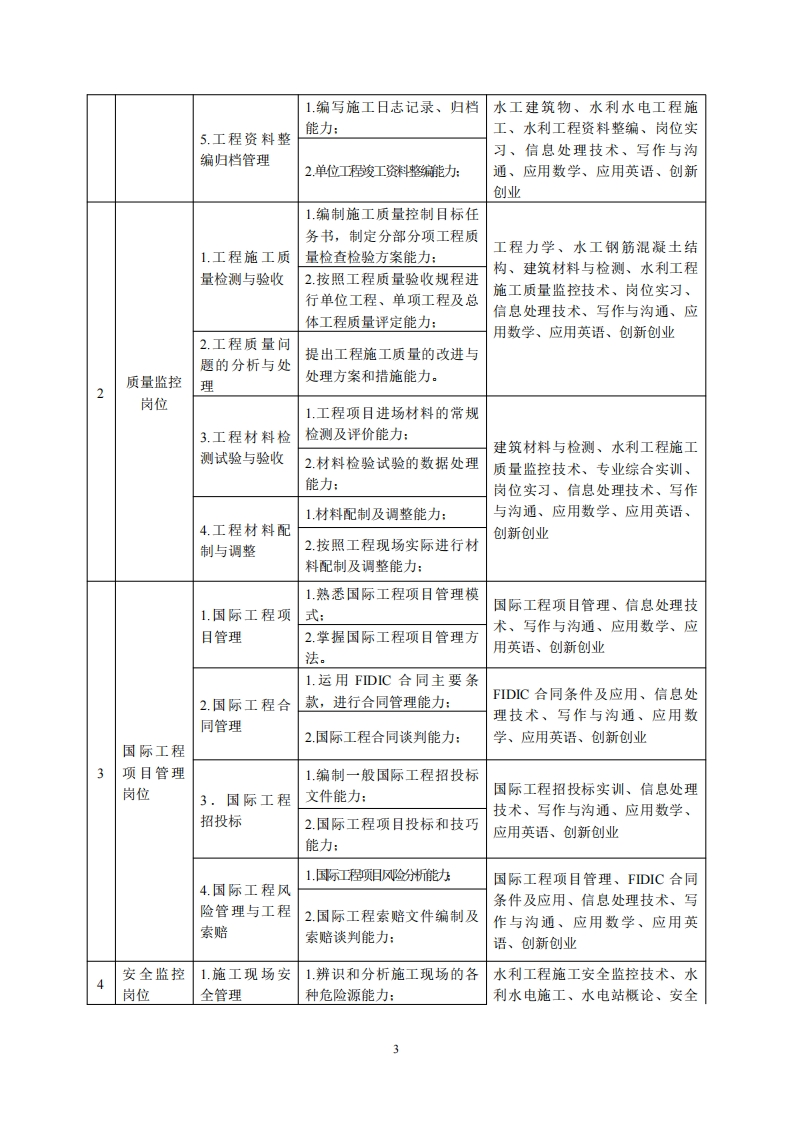 《水利水电建筑工程》专业人才培养方案一、专业名称及代码专业名称:水利水电建筑工程专业代码:450205二、入学要求招生对象:高中毕业生或具有同等学力者。招生类型:理科三、修业年限三年。四、职业面向(一)职业能力分析1.专业服务面向经过行业企业需求调研以及跟踪近三年本专业毕业生的就业岗位,大部分毕业生主要就业于水利水电工程施工企业(施工一线工程项目部),小部分就业于相关土建行业施工企业和水利水电工程勘测设计、工程管理等单位。(1)面向的主要技术岗位有:①施工技术管理岗位(施工员或技术员、测量员、资料员):②工程质量监控岗位(质量员、试验员、资料员):③国际工程项目管理岗位(合同管理员、风险与保险管理员、信息文档管理员、造价员)。④工程安全监控岗位(安全员、资料员):(2)面向次要技术岗位有:①勘测设计辅助岗位(测量员、绘图员、资料员):1