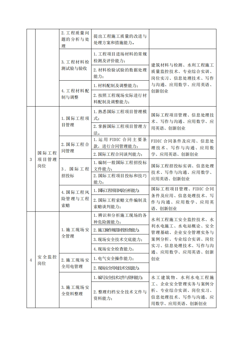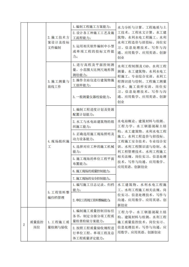 《水利水电建筑工程》专业人才培养方案一、专业名称及代码专业名称:水利水电建筑工程专业代码:450205二、入学要求招生对象:高中(中职)毕业生或具有同等学力者招生类型:理科三、修业年限三年。四、职业面向(一)职业能力分析1.专业服务面向经过行业企业需求调研以及跟踪近三年本专业毕业生的就业岗位,大部分毕业生主要就业于水利水电工程施工企业(施工一线工程项目部),小部分就业于相关土建行业施工企业和水利水电工程勘测设计、工程管理等单位。(1)面向的主要技术岗位有:①施工技术管理岗位(施工员或技术员、测量员、资料员):②工程质量监控岗位(质量员、试验员、资料员);③国际工程项目管理岗位(合同管理员、风险与保险管理员、信息文档管理员、造价员)。④工程安全监控岗位(安全员、资料员):(2)面向次要技术岗位有:①勘测设计辅助岗位(测量员、绘图员、资料员);②工程运行管理岗位(技术员、工程运行调度及维护人员);③土建行业施工岗位(施工员、质量员、资料员、测量员等。2.职业岗位与职业能力分析序号工作岗位典型工作任务职业能力支撑课程1.识读工程施工图纸并进行水利工程制图及CAD、水工建筑工程量计算能力:物、水利水电工程施工、水利工施工技术1.施工图识读管理岗位程图识读与绘制、岗位实习、信与技术交底2.与设计方进行施工图的技息处理技术、写作与沟通、应用术交流能力。数学、应用英语、创新创业