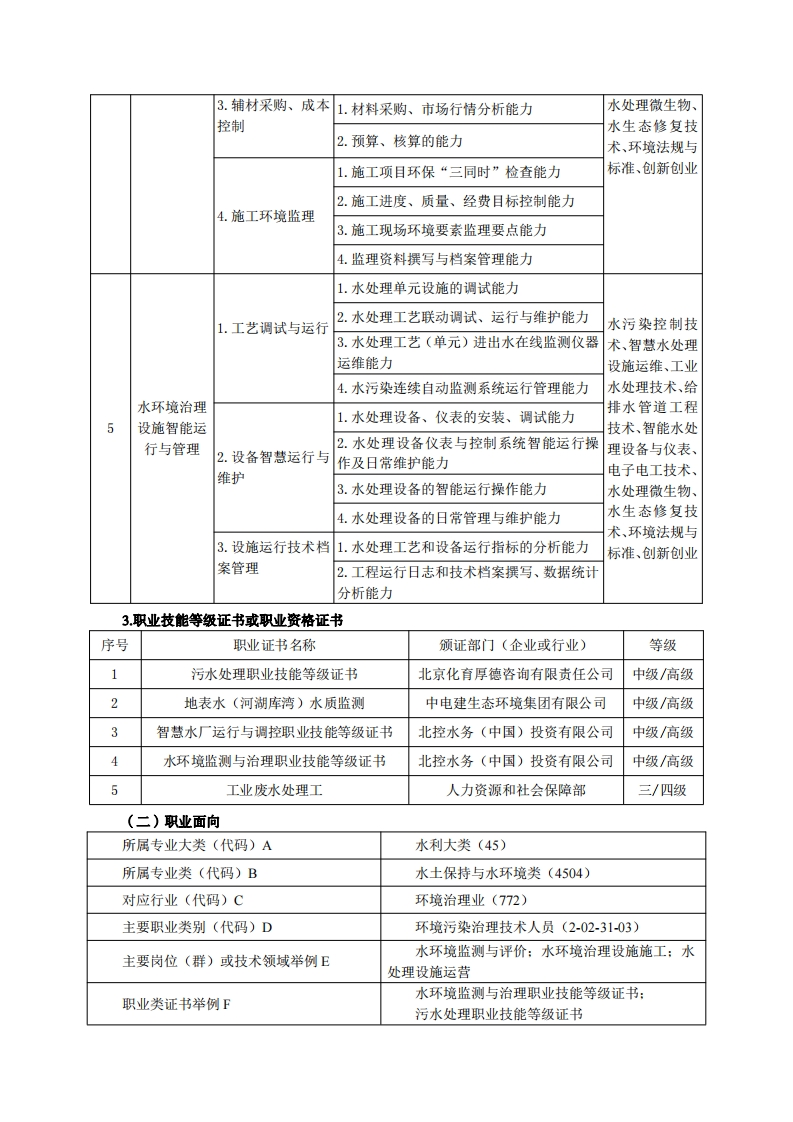 《水环境智能监测与治理》专业人才培养方案一、专业名称及代码专业名称:水环境智能监测与治理专业代码:450402二、入学要求招生对象:高中(中职)毕业生或具有同等学力者。招生类型:文理兼收。三、修业年限三年。四、职业面向(一)职业能力分析1.专业服务面向本专业主要面向环境与生态检测服务、生态保护和环境治理等职业,水环境保护监测、水生态系统保护管理、水污染治理等岗位群。学生毕业后的就业企事业单位主要有生态环境保护行政单位、水务工程公司、水生态修复公司、水环境工程公司、水环境检测公司、环境监测站、环境监理公司、自来水厂、污水处理厂(站)及纯净水生产企业等。2.职业岗位与职业能力分析序号工作岗位典型工作任务职业能力支撑课程1.水环境监测方案制定1.样品采集与交接2.采样仪器的使用与维护能力3.样品采集、处理、运输和交接能力化学分析技术、1.河流湖泊水质控制指标检测能力仪器分析、水污2.指标检测2.污水废水污染控制指标检测能力染连续自动监测系统运行管水环境监测3.生活饮用水与水饮料水质指标检测能力理、水处理微生与评价1.数据统计处理与结果表征能力物、水环境监测、环境法规与3.监测质量保证与2.实验室内质量控制能力标准、数据处理控制3.实验室间质量控制能力与统计、检测实4.环境监测档案文件管理能力验室管理、信息处理技术1.环境标准查找与解读的能力4.监测报告编写2.环境监测月报/季报/年报编写能力