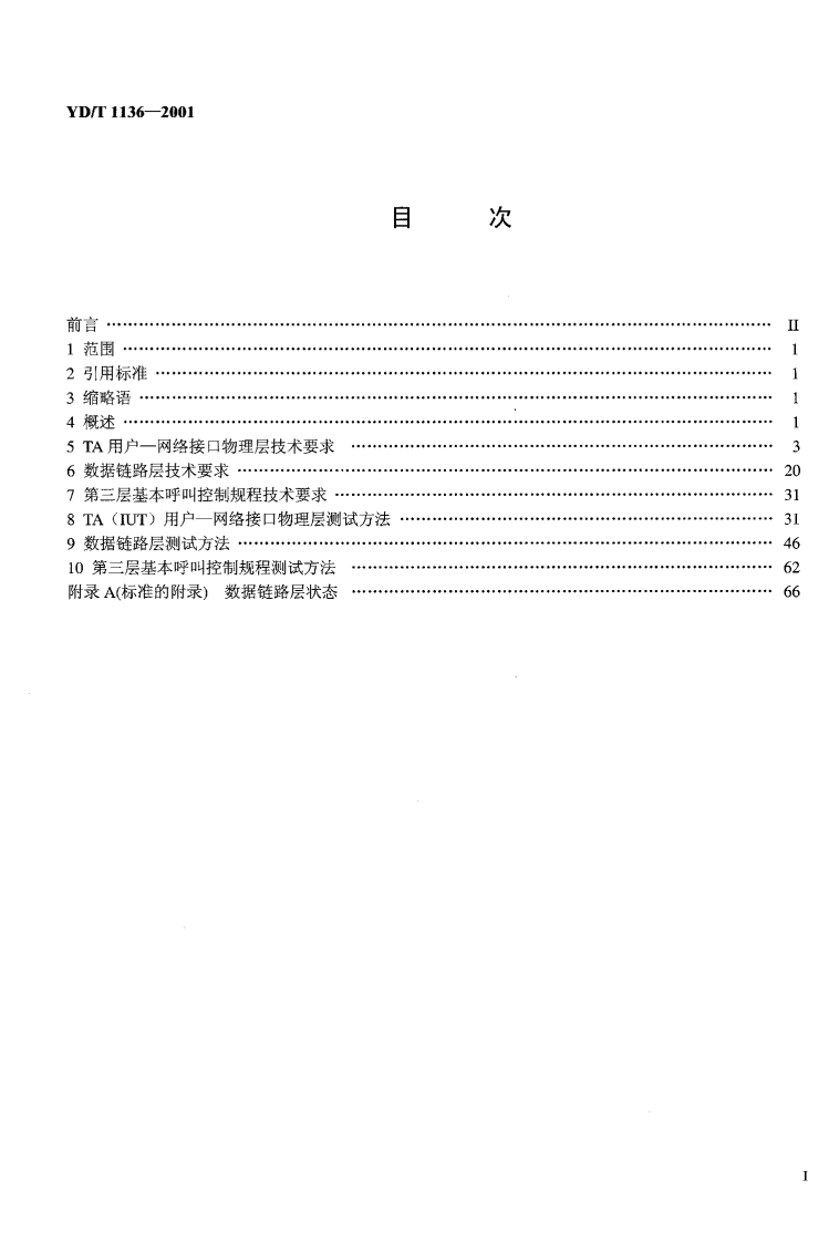 YD中华人民共和国通信行业标准Y①/T1136-2001综合业务数字网(ISDN)基本速率终端适配器(TA)技术要求及测试方法Technical requirements and testing methods of basic access terminaladapter (TA)of integrated sevices digital network (ISDN)2001-05-25发布2001-11-01实施中华人民共和国信息产业部发布