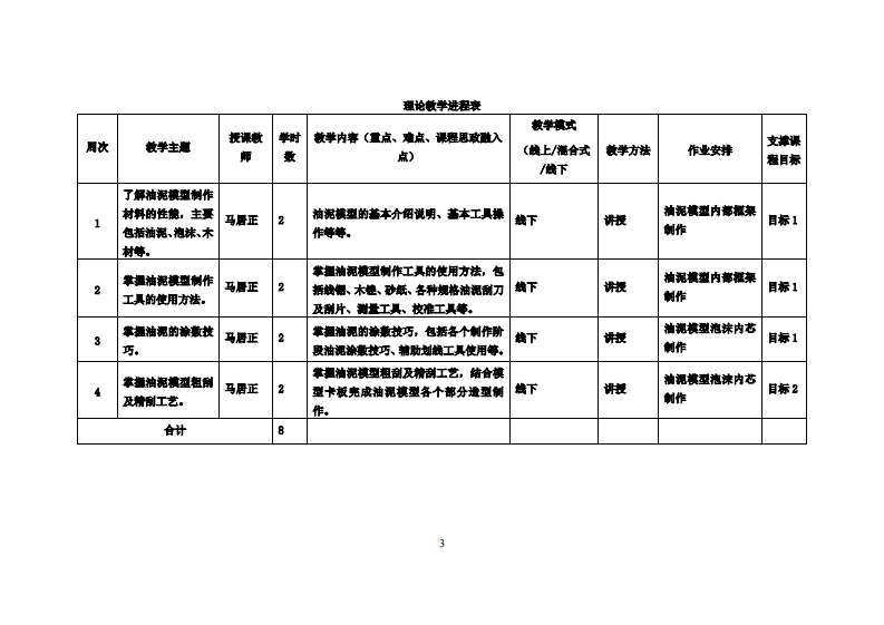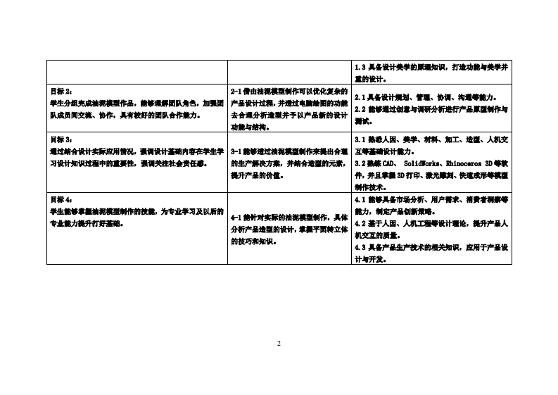 《油土制作与设计(一)》教学大纲课避名称:袖土创作与设计(一)课类别(必修/地修):选修课程英文名称:lenufacture and Design of Cla时总学时/周学时/学分,32其中实险/实液学时,24先修课是:后续课程支嫌:授课时间:周三34节(1-16周)授课地点:机电楼311提课对津:2021额工业设计座开裸学洗:粤合产业科妆学陕任课就师姓名/职前:马居正容鞭时间、地点与方式:课程考核方式:开港()闭卷()课程论文()其它(√)使用微村,《汽车袖泥横造型第2)》株业成机械工业出版社课座衡介:本课庭是工业设计专业学生的专业方向实我进恤课容之一,通过袖泥模型制作的程序和方法学习,结合具体实鹰,通过制作放法铺习,让举生充分迎解袖泥模型制作的意义、方法和基本程序,课程妆学目标及对毕业要求撒标点的支排:课在被学目标支撑毕业2要求指标点毕业要求目标1:1-1学女油泥慎型侧作对于设计系学生L.1掌量工业设计的础知识,能清审地将设计想训练学生在造型设计过程中能够合理利用相应村料、工具来说是非常重要的,靠建模的一些基法是现.及手段,快速准确地表达自己的设计振老,取得量准的设制作技法将有助于产品设计的糖力L2能够理舞智能制造的基本根含和原理来实现设计立体表达效果。提升计的目标。