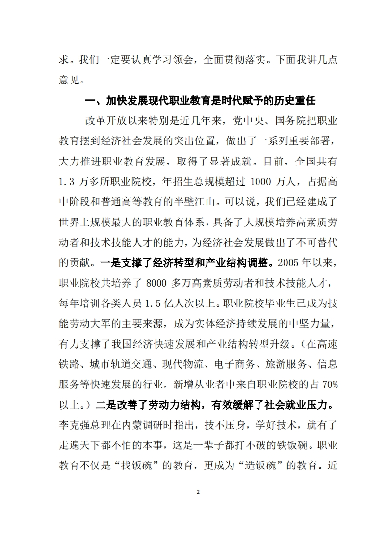 深化改革加快发展开创我国现代职业教育新局面一在全国职业教育工作会议上的讲话刘延东(2014年6月20日)同志们:这次会议,是新世纪以来召开的第三次全国职业教育工作会议。会议的主要任务是,深入贯彻落实党的十八大和十八届三中全会精神,总结近年来职业教育工作的成绩与经验,明确今后一个时期加快发展现代职业教育的目标、任务和措施,为促进经济社会发展,实现中华民族伟大复兴的中国梦做出更大贡献。党中央、国务院高度重视这次会议。会前,习近平总书记做出重要批示,国务院印发了《关于加快发展现代职业教育的决定》。刚才,李克强总理接见了会议代表并发表了重要讲话,从党和国家全局的战略高度,阐述了加快发展现代职业教育的重要性、紧迫性,分析了面临的新形势新任务,强调了需要重点解决的关键问题,对职业教育改革发展提出了明确要