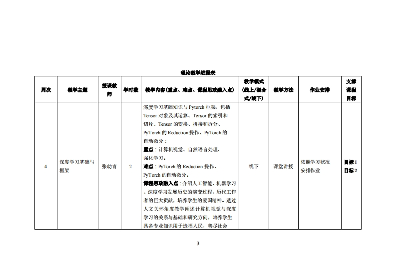 《深度学习》教学大纲课避名称:深度学习课和类别必修选修:必修课程英文名称:Deep Learning总学时周学时学分:32/32其中实检实液学时:16先课程:线性代数、概率论与数理统计、程序设计I,程序设计I1后续课程支撑:数据挖据与数据仓库授课时间:4+14周,周二5-7节授课地点:实606机房课对律:2021计技电商1班开裸学陕:粤台产业科技学院任课就甲姓名琳:张幼情/副教授答展时间、地点与方式:1课堂:每次上课的课前、课间和课后,采用一对一的问答方式2线上:QQ、微信等方式在线答凝3.课外:平时安排在303答疑,学期末安排1-2次专门的答凝时间课庭考核方式:开卷()闭卷()课程论文()其它(√)非试卷类报告使用微村:(动手学深度学习(yTorch))·何孝霆·人民邮电出版社,2023年2月第1版,ISBN:9787115600820课避物介:本课程是计算机科学与技术(跨境电商方向)的专业选修课·课程以PyT0©h为基础·介绍机器学习的基础知识与常用方法·全面细致地提供了基本机器学习操作的原理和在PyTh框架下的实现步骤。再由没入深地以实战案例讲解的方式,对于误差反向传插法、卷积运算等进行详细剖析,使读者在实现层面上理解:此外还加入了前沿技术,如Batch Normalization等内容。本课程讲解4个完整的项目案例、完整的构建过程,使学生能在实战案例中,深入完成机器学习技术中的深度学习的学习与掌握。授课内容将结合理论知识与范例操作,使本课程兼具理论性和实践性。传感器与检测技术是电子以1