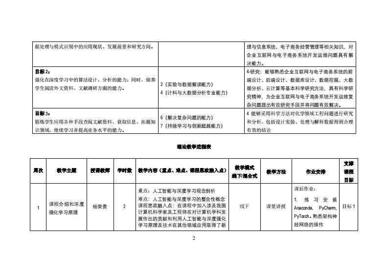 《深度学习》教学大纲课避名称,深度学习课和类别(必修造修):必修课程英文名称:Deep Leaming总学时周学时学分,32/2/2其中实检实艘学时,仿先继课是:具备Pm程序语言、数据结构、基础的数学和统计学知识。后续课程支撑毕业设计授课时间:1-6周星期一7-8)授课地点:机房503课对津:22电商1-2班开裸学瑰:粤台产业科技学院任课妆柳姓名职称:杨荣贵刷教授容鞭时间、地点与方式:课堂或课后,教室或通讯软件,当面或线上答凝课程黄方式:开卷()闭卷()课程论文()其它()作业、期末报告使用微村《深度强化学习理与实践》,陈桔,清华大学出版社,出版日期:2024-05-01,教材S8N:9787302660705妆学事考资料:《PyTc生成对抗网络编程》,韩江雷,人民邮电出版社,出版日期:202012,SBN:9787115546388课程物介:深度学习极大地推动了A的发展,使机器能够自动学习数据中的复杂模式,并在多个领域(如计算机视觉、自然语言处理、语音识别等)取得了突破性进展。课程内容将通过讲座、实际项目、案例分析和讨论来传授。学生将有机会使用流行的机器学习工具和框架,例如PyTo和S-ea,以实际动手经验深化他们的理解。课程妆学目标及对毕业要求州标点的支排:课程妆学目标支撑单业2要买求指标点华业要求目标1:1交叉知识的运用能力1工程知识:能够运用数学、基础科学、计算机科掌握深度学习的基本概念和相关技术,了解深度学习在数3(技术工具的应用能力)学与技术、企业互联网平台系统、电子商务信息管