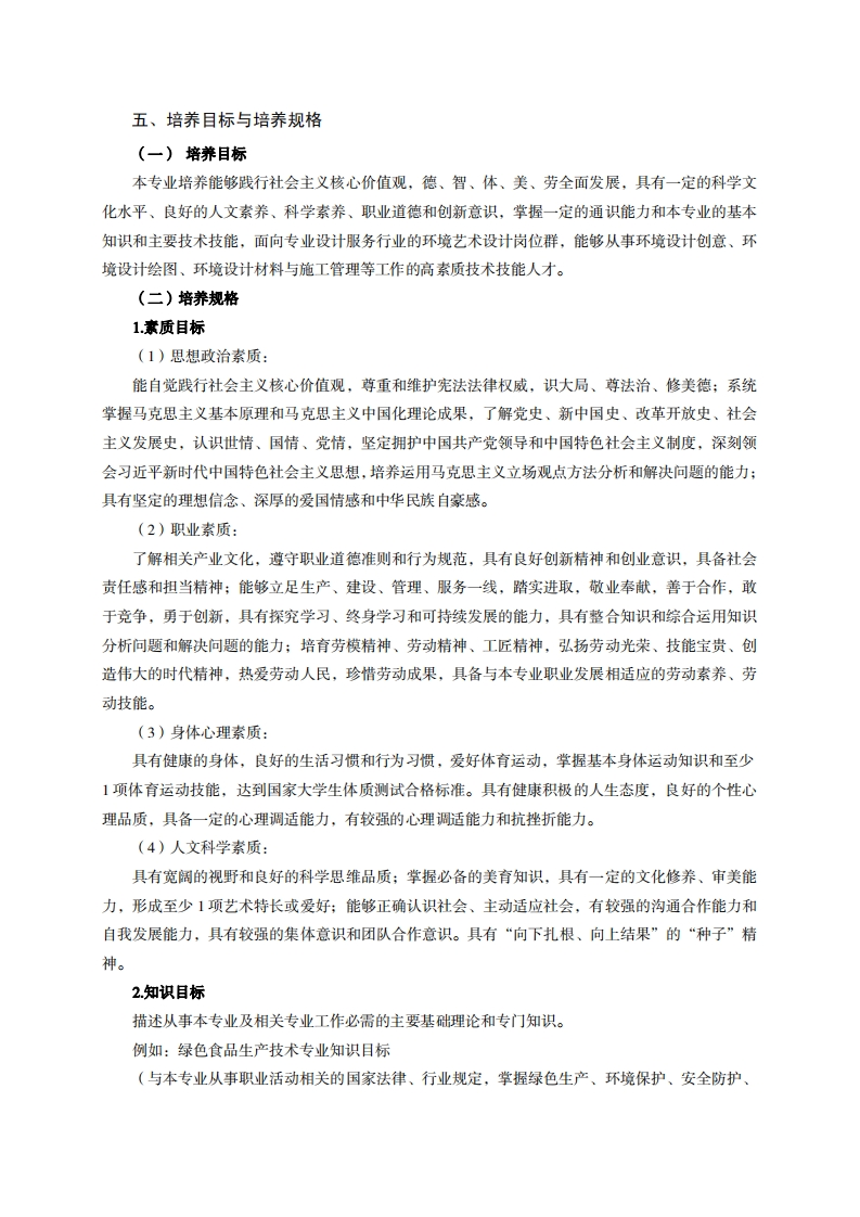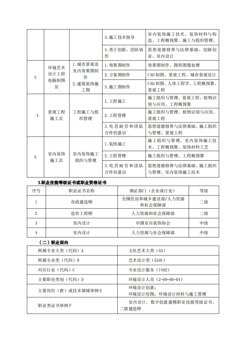 《环境艺术设计》专业人才培养方案一、专业名称及代码专业名称:环境艺术设计专业代码:550106二、入学要求招生对象:高中(中职)毕业生。招生类型:文理兼收。三、修业年限三年。四、职业面向(一)职业能力分析1.专业服务面向从事园林景观设计、室内装饰设计、装饰市场与业务、工程管理、工程验收、工程预算、项目制作、市场开拓、电脑制图、及环境艺术设计等工作。主要在环境景观设计公司、室内装修公司、艺术设计公司、房地产公司及城建规划单位等设计与管理工作。2.职业岗位与职业能力分析序号工作岗位典型工作任务职业能力支撑课程手绘表现技法、设计概论、城市景观设计、人体工程学、景观小品设计、1.设计与表现装饰材料与构造、园林艺术、效果图制作、景观设计综合实训思想道德修养与法律基础、园林艺景观设计景观及建筑小2.客户沟通与交流术、手绘表现技法、城市景观设计师品设计室内装饰施工技术、装饰工程概预3.施工技术指导算、施工与组织管理、景观工程施工技术4.勇于创新、团队协思想道德修养与法律基础、创新创作业、城市景观设计手绘表现技法、设计概论、室内设计、1.设计与表现人体工程学、装饰材料与构造、室内室内装饰室内及陈设设2陈设、色彩、设计素描、设计构成设计师计设计概论、手绘表现技法、室内设计、2.客户沟通与交流装饰材料与构造、室内陈设
