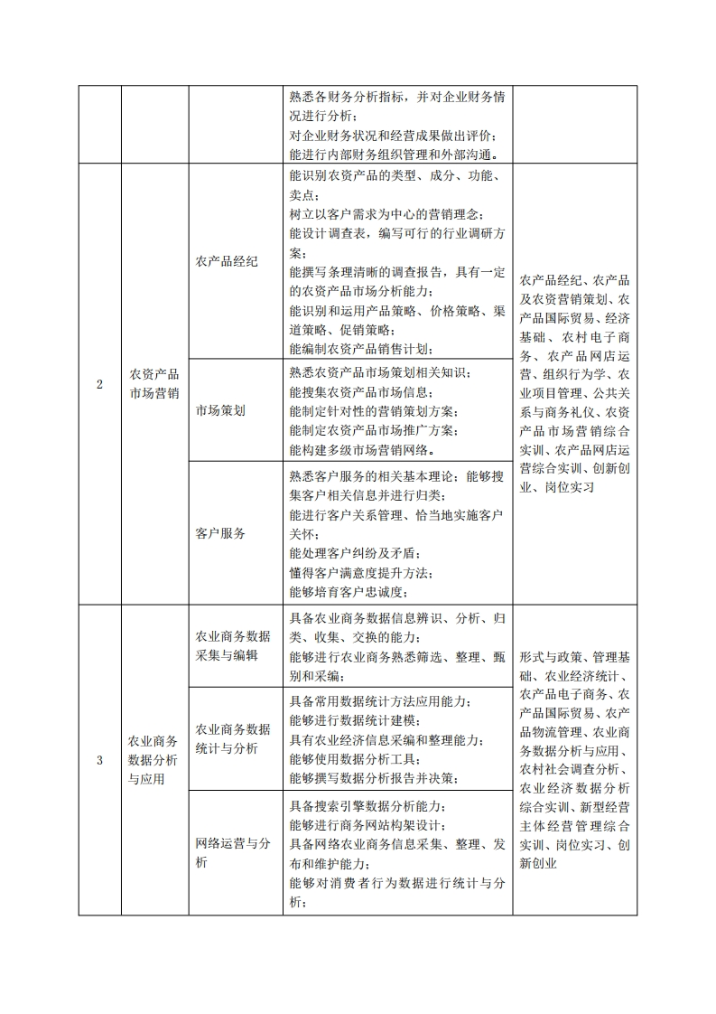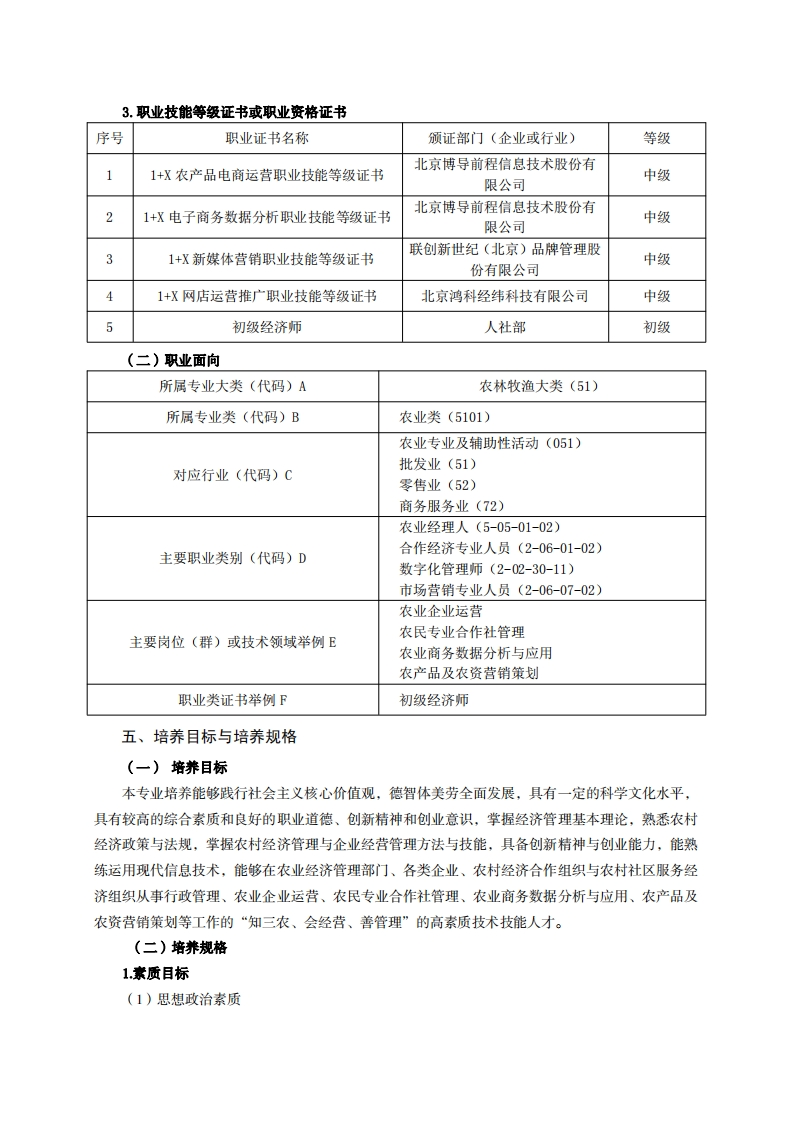 《现代农业经济管理》专业人才培养方案一、专业名称及代码专业名称:现代农业经济管理专业代码:410119二、入学要求招生对象:高中(中职)毕业生或具有同等学力者招生类型:文理兼收三、修业年限三年四、职业面向(一)职业能力分析1.专业服务面向对本专业学生的主要面向农业经理人等职业,农业企业经营与管理、农民专业合作社经营与管理、农业商务数据分析与应用、农产品及农资营销策划、农产品网店(实体店)运营等岗位(群)。2.职业岗位与职业能力分析序号工作岗位典型工作任务职业能力支撑课程能进行人员招聘计划的编制和实施:形式与政策、管理基人力资源管理能够完成企业人员培训:础、会计基础、农业绩效考核制度的编制和执行:会计实务、新型经营能够编写产品质量控制总结:主体经营管理、组织能够编制生产计划并组织实施:农产品生产作行为学、经济基础、能够执行安全生产操作,以及安全生产业管理农业经营管理、农村监督:投融资与税收、农村农业企法律政策、农业产业业、农民能进行料工费的控制及预决算:掌握质量管理工作的常用方法和工具:化、休闲农业与乡村1合作社、家庭农场农产品质量管掌握验收抽样和工序控制的方法:旅游、乡村振兴与可经营管理理掌握质量设计的方法和技术:持续发展、乡村领导掌握质量成本的概念以及计算方法实务与村民自治、农和评价方法。业项目管理、专业认能熟练运用资金预算编制方法进行财务知实训、新型经营主预决算及控制:体经营管理综合实财务管理能编制资金预算:训、市场运营模拟训能熟练分析资金结构和使用状况:练、岗位实习、创新能制定企业筹资、投资决策并实施:创业