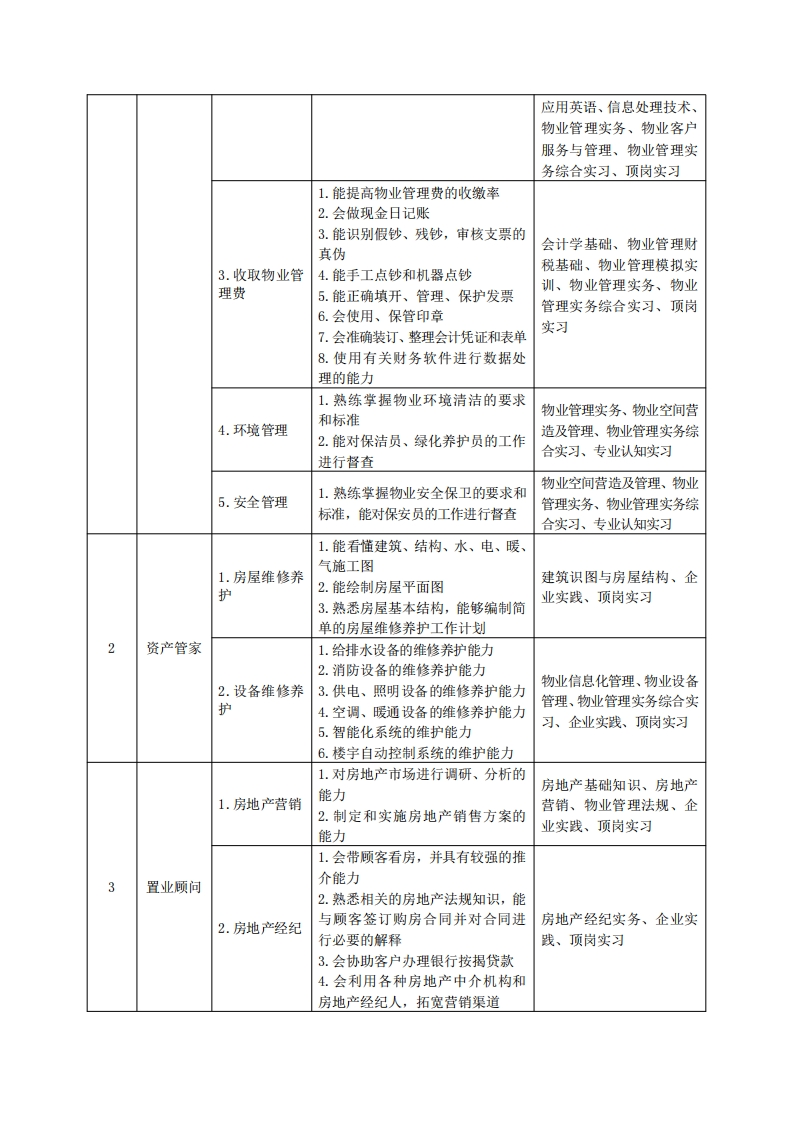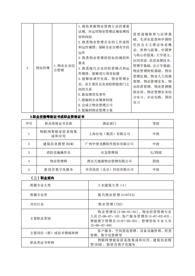 《现代物业管理》专业(世茂订单班)人才培养方案一、专业名称及代码专业名称:现代物业管理专业代码:440703二、入学要求招生对象:高中(中职)毕业生。招生类型:文理兼收。三、修业年限三年。四、职业面向(一)职业能力分析1.专业服务面向本专业主要就业单位为各类物业管理公司(写字楼物业、商场物业、住宅小区物业、公寓别墅物业、高层综合大厦物业、宾馆酒店物业、车站机场物业等)、房地产开发公司、房地产中介公司、企事业单位后勤部门及政府机关后勤事务。主要就业部门为物业管理公司客服部、管理部、工程部、安全管理部、财务部、人力资源部,房地产开发公司销售部等。主要就业岗位为楼宇管家、资产管家、置业顾问,可发展为物业经理。2职业岗位与职业能力分析序号工作岗位典型工作任务职业能力支撑课程思想道德修养与法律基础、毛泽东思想和中国特1.中英文沟通能力色社会主义理论体系概2.熟练运用办公软件的能力论、形势与政策、中国梦1.客户接待3.良好的人际交往能力与核心价值观、大学语文、4.能拟写各种常用应用文应用英语、信息处理技术、5.对市场经济和社会现象进行认商务礼仪、经济学原理、1楼宇管家识和分析的能力物业客户服务与管理、专业认知实习、物业管理模拟实训1.良好的人际交往和沟通能力思想道德修养与法律基2突发事件的处理能力础、毛泽东思想和中国特2.处理投诉3.能够纠正业主的违章行为色社会主义理论体系概4.能化解业主与业主之间、业主与论、形势与政策、中国梦物业管理公司之间的矛盾与核心价值观、大学语文、