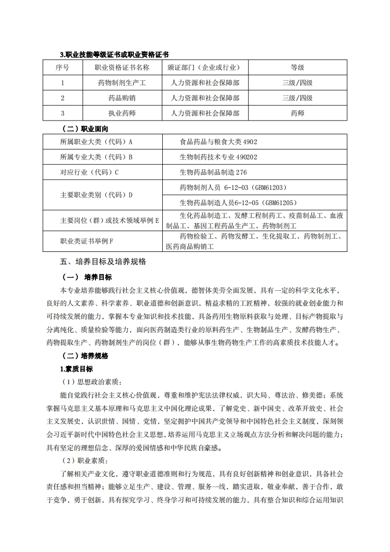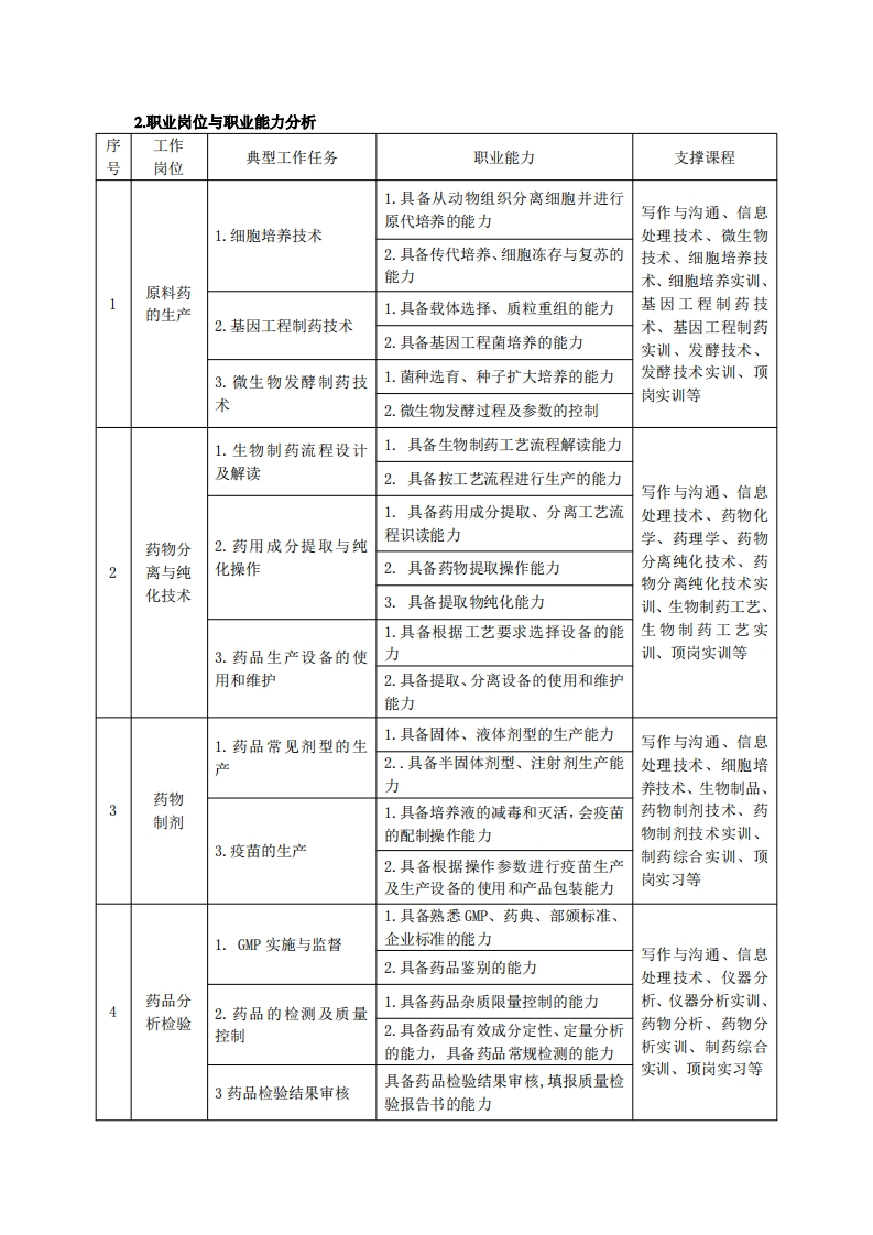 《生物制药技术》专业人才培养方案一、专业名称及代码专业名称:生物制药技术专业代码:490202二、入学要求招生对象:高中(中职)毕业生或具有同等学力者。招生类型:文理兼收。三、修业年限三年四、职业面向(一)职业能力分析1.专业服务面向生物制药专业培养生物制药行业高素质技术技能人才,该专业就业岗位群可分为原料药生产和储藏、药品分离纯化技术、药物制剂技术、生物药品质量控制四个部分。主要服务面向微生物药物发酵、疫苗制备、药物提取、药物制剂、药品分析检验、质量监督管理(QA、QC)等工作岗位。生物制药行业、企业原料药生产技术药物分离纯化技术药物制剂技术药物分析检测技术基因工程制药技术微生物发酵制药技术药品的预处理及提取技术药品的纯化及成品包装生物制品常见剂型的生产技药品分析检验技术药品质量监督管理(QAQC