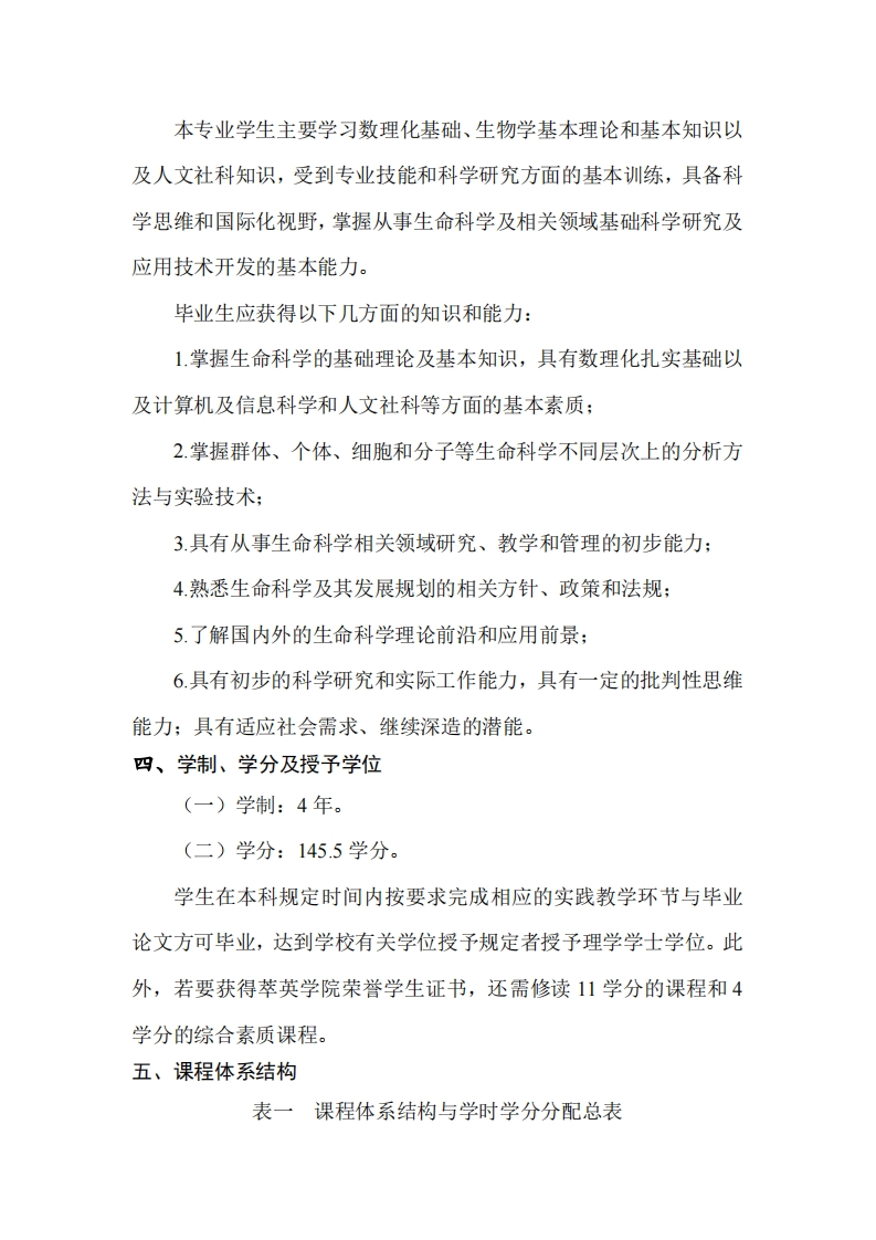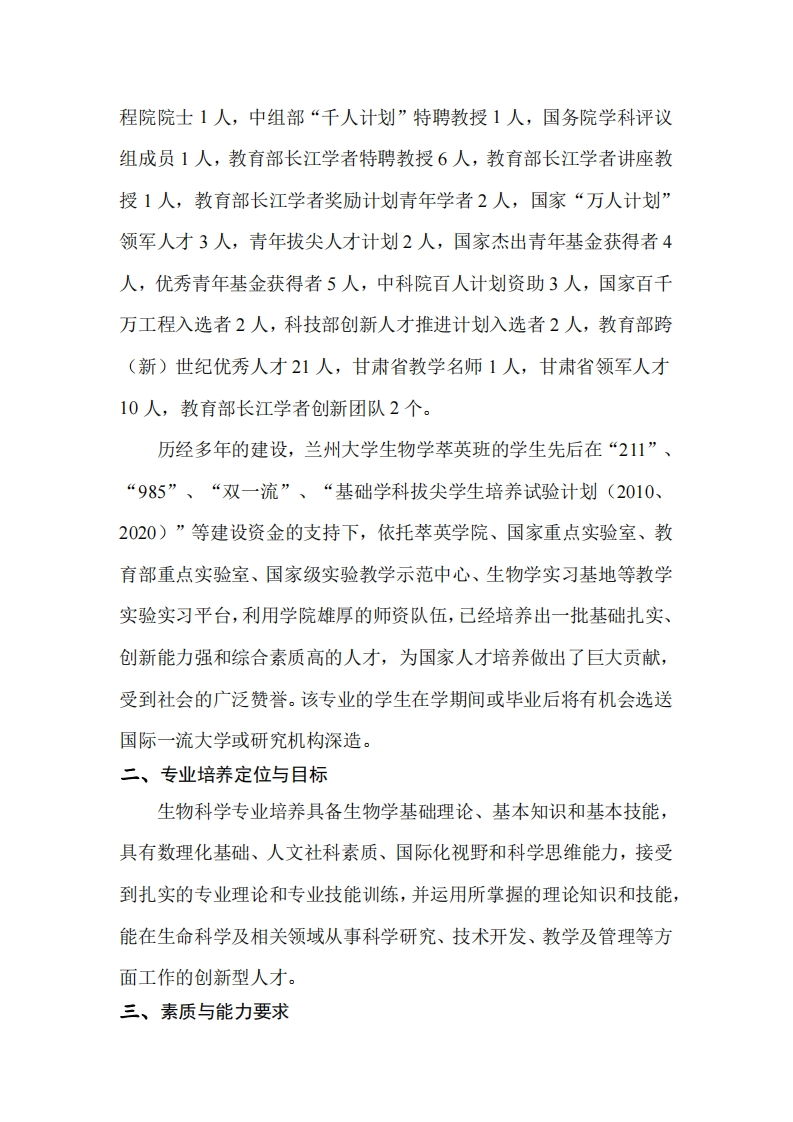 兰州大学“基础学科拔尖学生培养试验计划2.0”2019级生物科学专业人才培养方案一、专业简介专业名称:生物科学专业代码:071001兰州大学作为实施“基础学科拔尖学生培养试验计划”院校之一,于2010年设立生物萃英班,作为生物学科创新人才培养模式改革和试点平台,开展生物学拔尖学生培养模式的新探索。生命科学既是一门具有悠久历史的学科,又是当今蓬勃发展的热门学科。生命科学是研究生物的结构、功能、发生和发展的规律,以及生物与周围环境关系等的科学。在科技迅猛发展的21世纪,生命科学正从分子、细胞、个体和群体等不同层次上综合运用现代技术系统地研究生命的奥秘。生命科学作为自然科学研究的前沿领域,正成为发展最快、应用前景最广的学科之一,其研究成果为人类的健康与发展乃至整个世界的发展与变革带来了深远影响。生命科学的发展将推动我国国民经济的发展和社会生产力的发展。兰州大学生命科学学院的生物科学专业是整合动物学专业(1946年)、植物学专业(1946年)、植物生理学专业(1980年)、细胞生物学专业(1980年)、生物化学专业(1980年)等本科专业而建成的综合性理科专业。兰州大学生物科学专业是国家“国家生命基础学科人才培养基地”之一(1993年),教育部高等学校特色专业建设点(2009年),国家“基础学科拔尖学生培养试验计划”实施高校(2010、2020)。学院师资力量雄厚,专职教师队伍中有中国工