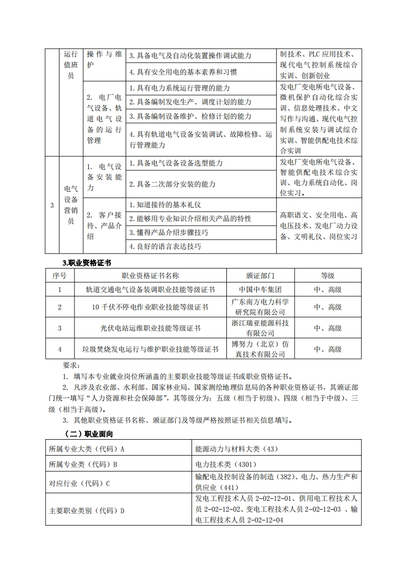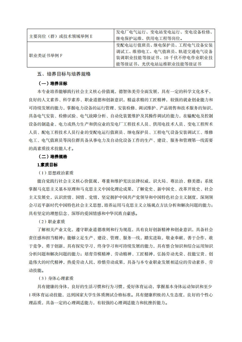 《电力系统自动化技术》专业人才培养方案一、专业名称及代码专业名称:电力系统自动化技术专业代码:430105二、入学要求招生对象:高中(中职)毕业生或具有同等学力者。招生类型:文理兼收。三、修业年限三年。四、职业面向(一)职业能力分析1.专业服务面向毕业生主要面向为电力系统服务的中铁电气化运营管理部门、中水集团、中核检修集团、西电集团、华能热电、长风新能源科技有限公司等发电企业、供电企业、电建企业、电力监理、电力设备制造等行业,一般从事电力企业的运行与管理、电力设备的安装与检修、电站的调试运行与维护、电力产品的销售和技术服务等工作。2职业岗位与职业能力分析序工作典型工作号岗位任务职业能力支撑课程1.具备机械识图能力和机械加工、装配能力机械制图、机械基础、电机及拖动技术、发电厂动1.发电机、2.具备电气制图、识图、电气安装能力力设备、发电厂变电所电变压器的3.具有电气设备安装、检修试验的能力电气安装检修气设备、维修电工综合实训、创新创业、劳动、安设备4.具有电气设备试验的组织能力和事故防范全用电1安装以及安全管理的能力检修1.具备机械加工、装配能力机械制图、机械基础、发2.依据行工业规范进电厂变电所电气设备、继2.具备电气故障分析的能力行电气设电保护与二次回路综合备的安装3.具备排除故障的能力实训、现代电气设备安装与调试综合实训、岗位实检修4.具有设备安装检修的能力习机电1.电气设1.知道电气设备日常保养项目专业认识实习、安全用2设备备的日常2.具备电气设备、自动化装置维护的能力电、高电压技术、电气控