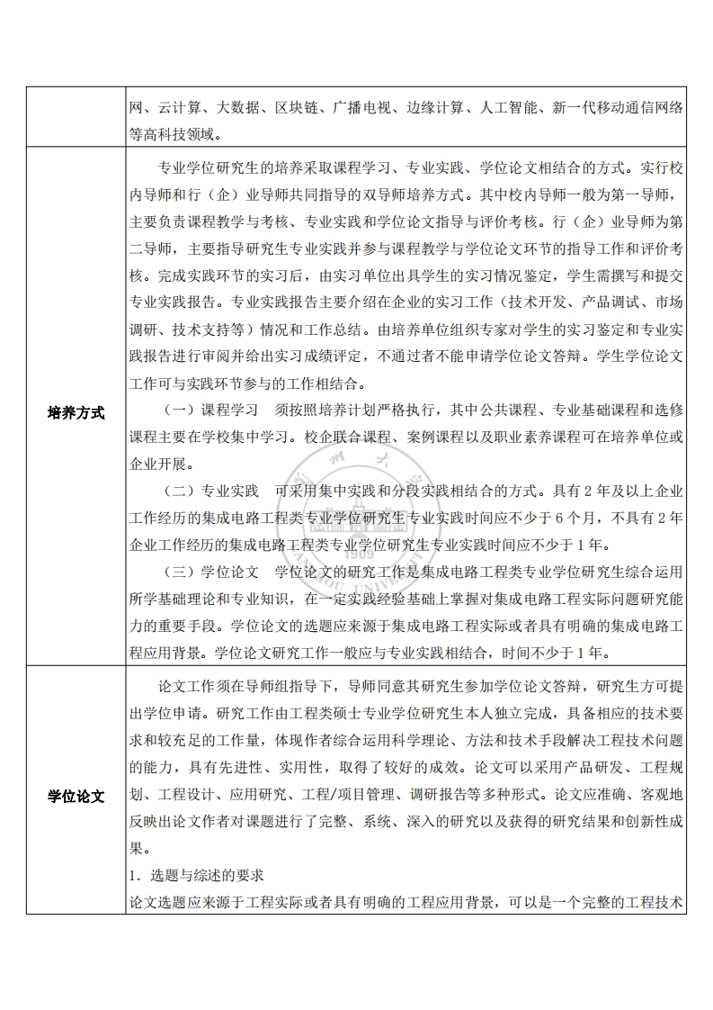 电子信息专业学位研究生培养方案材料与能源学院、物理科学与技术学院一级学科(0854)电子信息学院培养方式全日制适用年级2022级覆盖二级学科(085400)电子信息;学制年限与学生类别学制最长在学年限课程学分必修环节总学分学分要求硕士生3年4年25833以习近平新时代中国特色社会主义思想为指导,全面贯彻党的教育方针,培养德智体美劳全面发展的电子信息专门人才。培养目标面向经济社会发展和行业创新发展需求,培养在集成电路工程领域具有集成电路设计、集成系统设计、集成电路制造、测试、封装、材料制备与设备制造等方面的应用型、复合型高层次工程技术和工程管理人才。(一)拥护中国共产党的领导,热爱祖国,遵纪守法,具有服务国家和人民的高度社会责任感、良好的职业道德和创业精神、科学严谨和求真务实的学习态度和工作作拉6动h风,身心健康。(二)掌握集成电路行业领域坚实的基础理论、宽广的专业知识及管理知识,熟基本要求悉行业领域的相关规范,掌握解决集成电路工程领域技术问题的先进方法和现代手段,在集成电路行业领域的某一方向具有独立担负工程规划、工程设计、工程实施、工程研究、工程开发、工程管理等专门技术工作的能力,具有良好的职业素养。(三)掌握一门外国语,能够顺利阅读本领域国内外科技资料和文献。集成电路工程涵盖集成电路设计、制造、测试、封装、材料、设备等技术研发以及集成电路在网络通信、数字家电、信息安全等方面应用的工程技术领域。集成电路高密度、小尺度、高性能的特点,使得集成电路工程技术成为当今最具有渗透性和综合性的工程技术领域之一。集成电路设计和制造作为应用产品的核心,是现代电子系统面向用培养方向户、面向产品、面向应用赢得竞争力的要求,同时也是传统产业升级和改造的关键。集成电路应用相关的工程领域包括电子科学与技术、信息与通信工程、计算机科学与技术、控制科学与工程、仪器科学与技术、核科学与技术、电气工程、汽车工程、光学工程、生物医学工程、兵器工程、航天工程等学科交叉领域,面向物联网、新媒体、全光
