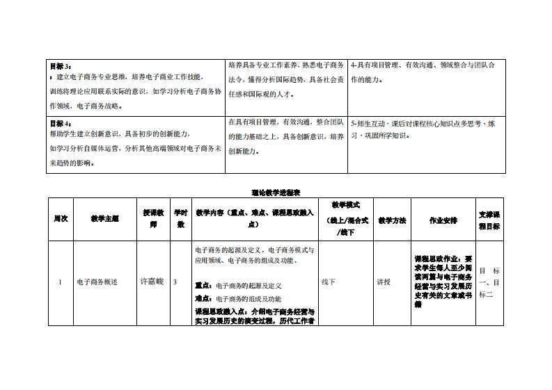 《电子商务经营与实习》教学大纲裸名称电子商务经营与实习课类别(必修选修)选修课程英文名称:B-comere●Management and Internship总学时周学时学分,48W3/3其中实整实被学时0先德课程:无后续课建支撑无授课时间:1-3节(318周)授课地点:5307量课对津:2020级跨境电商1班开裸学瑰:粤台产业科技学院任课微柳姓名淋:许嘉梭刷教授容票时间、地点与方式:课堂或课后,教室或通讯软件,当面或线上答疑课避考核方式:开卷()闭卷()课程论文()其它()非试卷类报告使用被材:电子商务概论与实训数程(第4版),王忠元,机械工业出版社,202203,1SBN:9787111700180被学◆考资料:(1)《电子商务概论》:作者:罩征:出版社:高等教育出版社:ISBN:978704052609课程情介:本课程注重培养实战型人才。让学生掌握电子商务的产生骨景、基本概念、类型和相关主流模型与理论,了解目前国内外电子商务的发展战略。同时学习与电子商务管理相关的知识,如相关的法律和税收政策、国际贸易等,以及电子商务的发展趋势。掌握基本的电子商务案例分析方法和电子商务