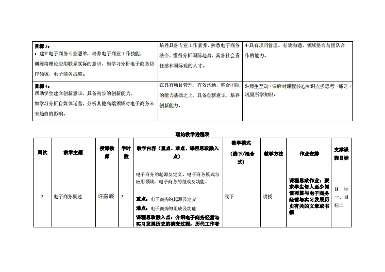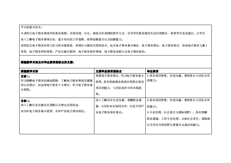 《电子商务经营与实习》教学大纲裸名称电于商务经营与实习课和类别(必修选修):选修课程英文名称:B-commero●0prat1c如and Internship总学时周学时学分,3222其中实检实被学时,16先旅课程:管理学、经济学后续裸理支排网络营销、网络金融与支付提课时间:星期二第1、2节(1-16周)授课地点:莞城5303授课对律:23计机科学与技术专业(跨境电商)开裸学瑰:粤台产业科技学院任课妆柳姓名淋:许嘉峻/刷教授容鞭时间、地点与方式:课堂或课后,教室或通讯软件,当面或线上答疑课避考核方式:开卷()闭卷()课程论文()其它()非试卷类报告使用被材:电子商务概论与实训数程(第4版),王忠元,机械工业出版社,2022-03,1SBN:9787111700180被学◆考资料:(1)《电子商务概论》:作者:罩征:出版社:高等教育出版社:ISBN:978704052603课程情介:本课程注重培养实战型人才。让学生掌握电子商务的产生骨景、基本概念、类型和相关主流模型与理论,了解目前国内外电子商务的发展战略。同时学习与电子商务管理相关的知识,如相关的法律和税收政策、国际贸易等,以及电子商务的发展趋势。掌握基本的电子商务案例分析方法和电子商务