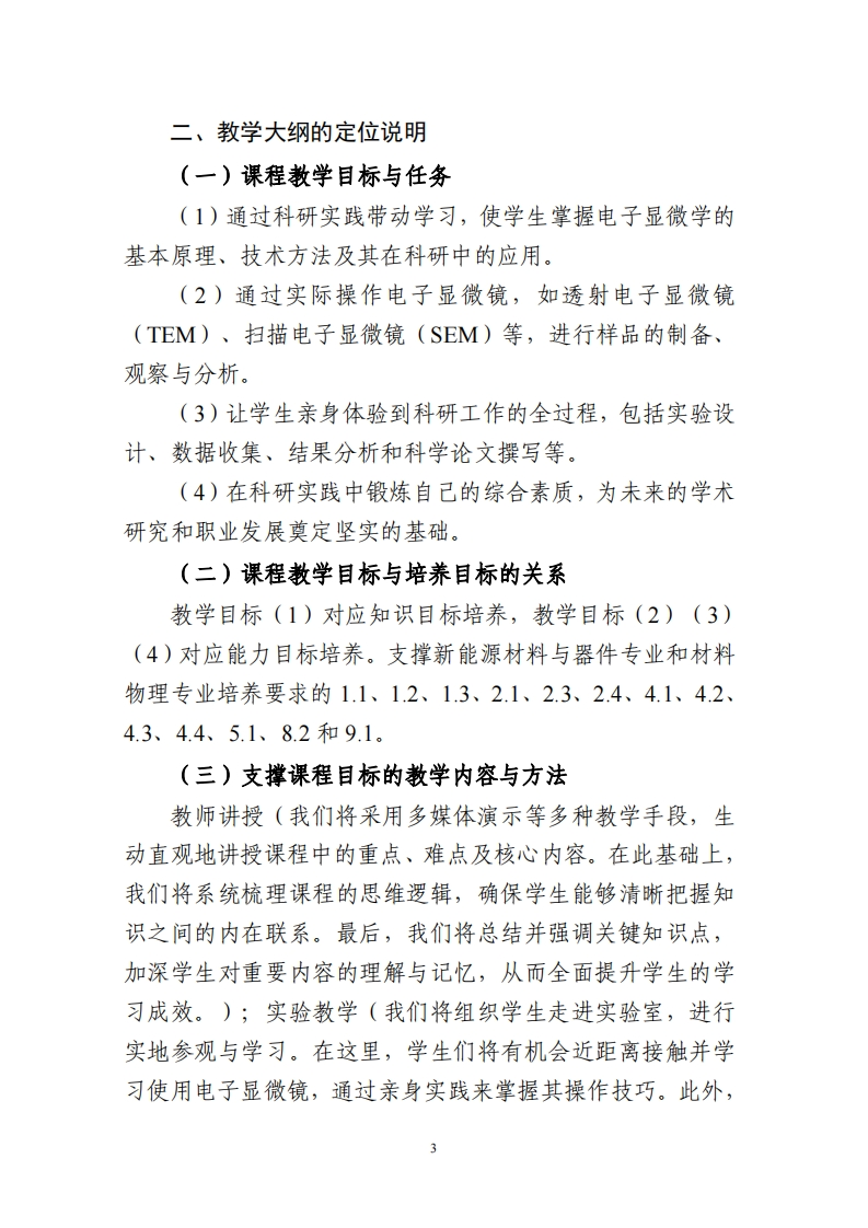 《电子显微学前言》课程教学大纲一、课程概况课程名称电子显微学前沿课程号107412011课程英文名称Frontiers of Electron Microscopy学时/学分72/2课程性质选修适用专业材料物理、新能源材料与器件彭勇,邓霞,胡阳,朱柳,课程负责人张军伟教学团队关超帅,蒙萱,李华,穆晓柯,王凯,张利利,王君,司明苏选用散材及教材:《透射电子显微学》David B.Williams著,李建奇译参考书目课程简介:电子显微学前沿是一种创新的教学模式,旨在将科学研究与课堂教学紧密结合,为材料科学、化学、物理及相关领域的学生提供一个深入学习和实践电子显微技术的平台。本课程不仅注重理论知识的传授,更强调通过实际科研项目带动学习,使学生在实践中掌握电子显微学的核心技能,并培养其解决复杂科学问题的能力。在该课程中,学生将直接参与到导师的科研项目中,通过实际操作电子显微镜,如透射电子显微镜(TEM)、扫描电子显微镜(SEM)等,进行样品的制备、观察与分析。这一过程不仅有助于学生深入理解电子显微学的基本原理和仪器构造,更能让他们亲身体验到科研工作的全过程,包括实验设计、数据收集、结果分析和科学论文撰写等。课程目标(Course Objectives,CO)理解电子显微学的基本原理和仪器构造知识目标(C01)了解电子显微镜在材料科学、化学、物理及相关领域的应用能力目标(C02)获得扎实的电子显微学知识和技能培养学生解决复杂科学问题的能力培养他们的创新思维和团队协作能力素质、情感价值观目标(CO3)在科研实践中锻炼学生的综合素质回PM1讲授法教学12学时16.67%回PM2研讨式学习8学时11.11%口PM3案例教学学时%口PM4翻转课堂学时%教学方式(PedagogicalMethods.PM)口PM5混合式教学学时%口PM6体验式学习学时%口PM7讨论教学学时%☒实践教学52学时72.22%