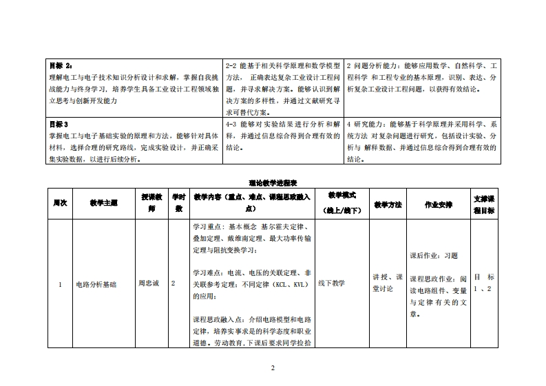 《电子电工技术》教学大纲裸程名称:电子电工拉术课和类别(必修/选修),修课程英文名称:Electronic and electrical technology总学时/周学时/学分:32/2/2其中实整/实液学时6先修课程:高整兼学、大学物理基赠电韵后续课程支排授课时间:周三12授课地点:211提课对律:2022工业设计开课学跳事合产业科妆学陕任课数甲姓名职称:周忠诚/副教授答票时间、地点与方式:课间_任何时段:课后_预约即可课程考核方式:开卷(W)闭卷()课程论文()其它()使用微材,《模拟电路和数字电路白学手册》,蔡杏山主编,人民邮电出版社,1SW9787115486417课程物介:本课程介绍模拟电路、数字电路和电力电子电路,主要内容有电路分析基础、放大电路、集成运算放大器、电源电路、数字电路基础与门电路、数制编码与逻辑代数、组合逻辑电路、时序逻辑电路、脉冲电路、A/D(模/数)和D/A(数/模)转换电路、控制技术、交流调压电路、交-变变频电路。它的墩学目的是培养学生具有电路学的专业知识,以及应用这些知识进行各种电路的分析方法的能力.课程数学目标及对毕业要求指标点的支排课程教学目标支撑毕业要求指标点毕业要求目标1:1-1能将数学、自然科学、工程基础1工程知识:能够将数学、自然科学、工程基础了解电工与电子技术知识,培养具有工业设计专业知识与及专业知识用于工业设计工程问题的和专业知识用于解决复杂工业设计工程问题。技能的工程技术人才表述。
