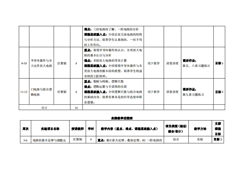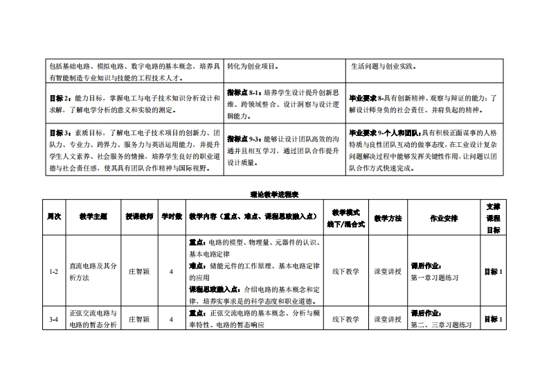 《电子电工技术》教学大纲裸程名称:电子电工技术课密类别(必修选修),必修课程漢文名称:Electronic and Electrical Techology总学时周学时学分,32/22其中实险实液学时:16先继课是:高等数学后续课程支排单片机原理及应用、人机工程学授课时间:1-16周星期三1-2节授课地点:5207、机电楼201提课对律:2023工业设计1班开裸学晓:粤台产业科技学院任课就姓名淋:庄智领/副教授答时间、地点与方式:1每次课的课前、课间和课后,采用一对一的问答方式2每次习题课,采用集中讲解方式。课狸考楼方式:开卷()闭卷()课程论文《)其它(√)非试卷类报告使用微材:《电工电子技术基础》,许其清,机械工业出版社,ISBN:9787111693048。课难情介:本课程介绍基础电路、模拟电路和数字电路,主要内容有:电路的基础概念和基本定律、电路的分析计算方法、正弦交流电路、一阶线性电路的暂态分析、常用半导体器件、基本放大电路及其应用、逻辑代数基础、组合逻辑电路。本课程是后续一些专业课程诸如单片机原理及应用、人机工程学等课程,为一门极重要的理论性课程,它的教学目的是培养学生具有电路学、模拟电路、数字逻辑的专业知识,以及应用这些知识进行各种电路的分析方法。课程数学目标及对毕业要求州标点的支排:课应妆学目标支撑串业要求指标点毕业要球目标1,知识目标,使学生了解电工与电子技术的知识,指标点6-2:能将专业知识与设计议题毕业要求6能活用所学专业知识并整合与运用至