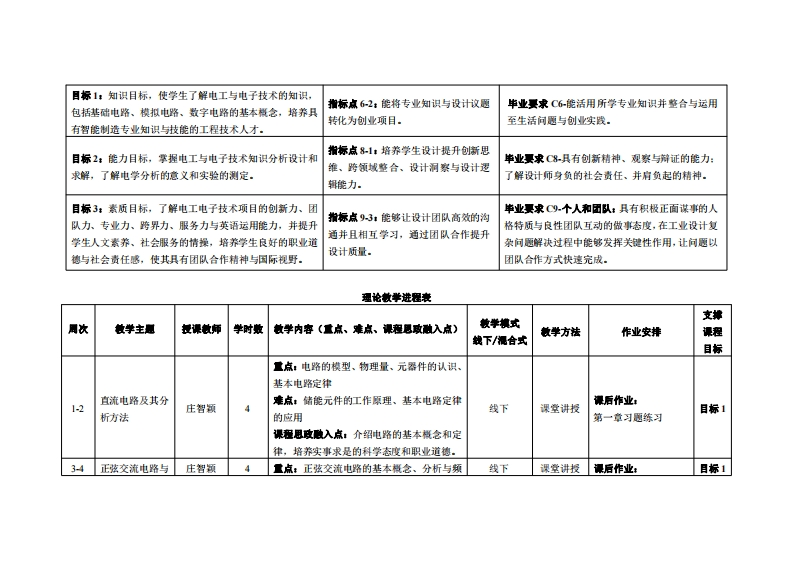 《电子电工技术》教学大纲裸程名称:电子电工技术课程类别(必修选修),必修课程英文名称:曰ectronic and曰ectrical Technology总学时周学时/学分,3222其中实险实戒学时:16先维课是:高等数学后续课程支撑:单片机原理及应用、人机工程学授课时间:1-16周星期三5-6节提课地点:6308、机电授201望课对津:2024工业设计1班开课学洗:粤台产业科技学院任课敏师姓名淋:庄智领/副教授容疑时间、地点与方式:1每次课的课前、课间和课后,采用一对一的问答方式:2每次习题课,采用集中讲解方式课是考核方式:开卷(√)闭卷()课程论文()其它()使用微材:《电工电子技术基础》,许其清,机械工业出版社,ISBN:9787111693048做学◆考度料:《电工电子技术》,陈佳新,机械工业出版社,1SBN:9787111663201.课程物介:本课程介绍基础电路、模拟电路和数字电路,主要内容有:电路的基础概念和基本定律、电路的分析计算方法、正弦交流电路、一阶线性电路的暂态分析、常用半导体器件、基本放大电路及其应用、逻辑代数基础、组合逻辑电路。本课程是后续一些专业课程诸如单片机原理及应用、人机工程学等课程,为一门极重要的理论性课程,它的教学目的是培养学生具有电路学、模拟电路、数字逻辑的专业知识,以及应用这些知识进行各种电路的分析方法。课程妆学目标及对毕业要求指标点的支排:裸程妆学目标支撑毕业要求指标点单业要求