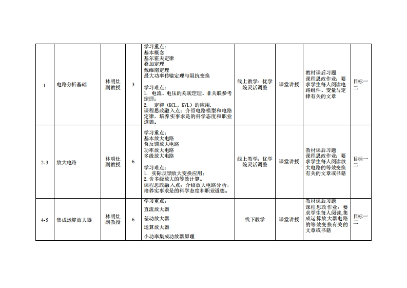 《电工与电子技术》教学大纲课程名称,电工与电子拉术课类别(必修选修):任选课课程英文名称:Electrical and electronic technolog四y总学时周学时学分,8/3/3其中实验实线学时:先体课是:基地电苹后铁课程支雄授课时间:周。周节授课地点:裸对津:2020智能制造工程1、2班开裸学瑰:粤台产业科技学院任课救姓名膏:林明灶/副教授答乘时间、地点与方式:1每次课的课前、课间和课后,采用一对一的问答方式:2每次习题课,采用集中讲解方式课程考核方试:开卷(√)闭卷()课程论文()其它(√)使用微村《模拟电路和数字电路白学手册》,蔡杏山主编,人民邮电出版社,ISBN9787115486417课程简介:《电工与电子技术》介绍模拟电路、数字电路和电力电子电路,主要内容有电路分析基础、放大电路、集成运算放大器、电源电路、数字电路基础与门电路、数制编码与逻辑代数、组合逻辑电路、时序逻辑电路、脉冲电路、A1D(模/数)和DA(数/模转换电路、控制技术、交流调压电路、交变变频电路。本课程是后续一些专业课程诸如电子技术、自动控制等课程,为一门极重要的理论性课程,它的教学目的是培养学生具有电路学的专业知识,以及应用这些知识进行各种电路的分析方法的能力