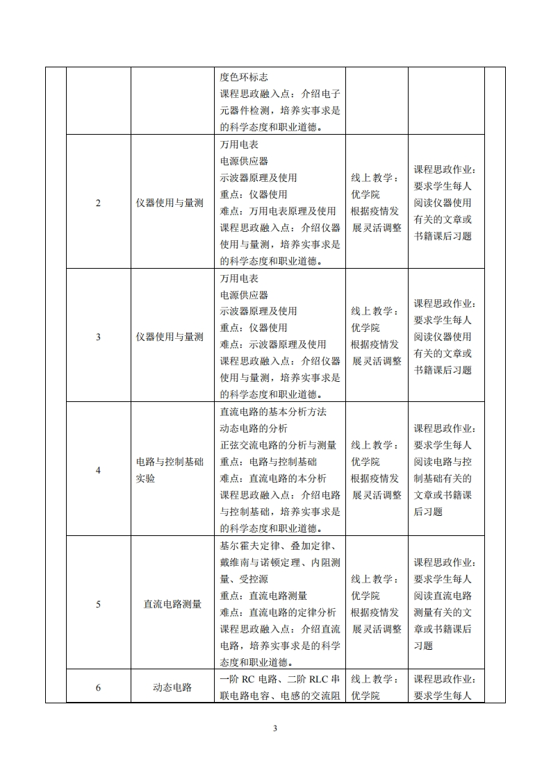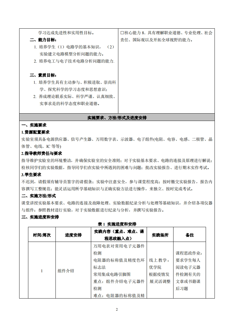 《电工实验》教学大纲课程名称:电工实验实践类别:口实习口实训口课程设计■实验课程英文名称:Electrician experiment周数/学分:48/33授课对象:2019级智能制造工程1、2班开课学院:粤台产业科技学院开课地点:■校内(机电楼201)口校外(任课教师姓名/职称:林明灶/副散授教材、指导书:《电子技术实验教程》(第2版,普通高等教育“十二五”电工电子基础课程规划教材),作者:于海雁主编出版社机械工业出版社出版时间:2014年09月。ISBN:9787111477488教学参考资料:精品资源共享课网站线上:优学院考核方式:开卷()闭卷()课程论文()其它(√)答疑时间、地点与方式:1每次课的课前、课间和课后,采用一对一的问答方式:2.每次习题课,采用集中讲解方式。课程简介:本课程是实践性强的专业技术课程,与相关理论定理及工程实践联系紧密,它的教学目的是培养学生具有实践的能力,将所学的电路分析基础、模拟电子技术等基本知识,利用各类组件加以验证,从理论学习到实作检验,加深知识的印象课程教学目标(见理论课程示例)本实践环节与学生核心能力培养之间的关联(授课一、知识目标:对象为理工科专业学生的课程填写此栏):1、了解实验基本要求、电路的连接及故障■核心能力1.应用数学、基础科学和智能制造工程处理,并学习对于实验数据纪录的分析与专业知识能力:处理。■核心能力2.设计与执行智能制造工程专业相关2、运用电路学的基本知识,了解电路的基实验,以及分析与解释相关数据的能力:本概念、相关理论、定理,并以实验建立■核心能力3.智能制造工程领域所需技能、技术以电路模型,用以验证理论的真实性。及实用软硬件工具的能力:3、利用实验,将理论与实际应用结合起来,■核心能力4.智能制造工程系统、零部件或工艺流通过虚拟实验以及验证性、综合性、设计程的设计能力:性和研究性等多层次实验来提高学生的■核心能力5.项目管理、有效沟通协调、团队合作动手能力。及创新能力:4.本课程学习电工与电子技术,重在实习,口核心能力6.发掘、分析与解决复杂智能制造工程注重动手、加强实践、培养兴趣和激励创问题的能力:新。实验层次包括验证性实验、综合性实■核心能力7.认识科技发展现状与趋势,了解工程验、设计性试验和创新性实验,以适应新技术对环境、社会及全球的影响,并培养持续学习形势下电工与电子技术教学,使得本课程的习惯与能力: