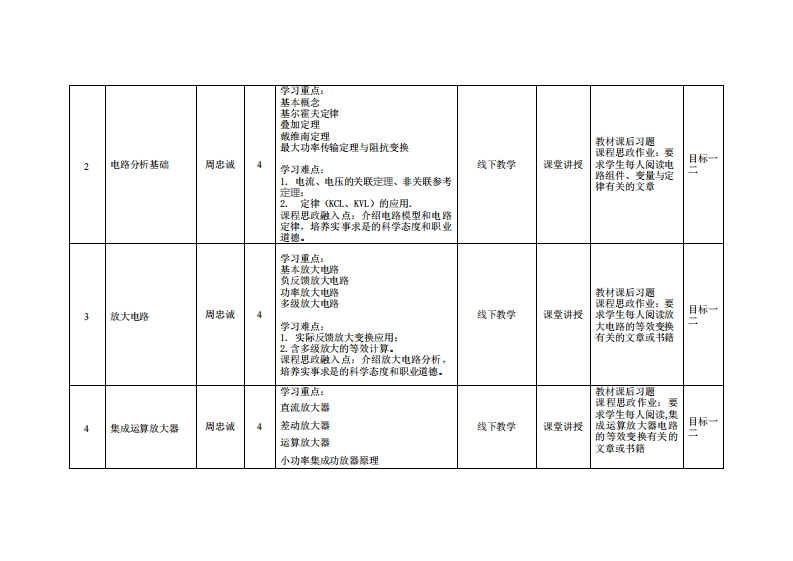《电工电子技术》教学大纲课避名称,电工电子妆术课类别(必修选修):必楼课程英文名称:Electrical and electronic technology总学时周学时学分,644其中实验实艘学时:24先体课是:基池电单后续课程支雄授课时间:期五1-3节(2-17周)、星期二1-2节(9-16周)授课地点:5208没课对津:2021智能制造2班开裸学洗:粤合产业科妆学陕任课救姓名淋:周忠诚/刷教授答展时间、地点与方式:1每次课的课前、课间和课后,采用一对一的问答方式:2每次习题课,采用集中讲解方式。课狸考楼方式:开卷(√)闭卷()课程论文()其它(√)使用微村:《模拟电路与数字电路》,寇戈主编,电子工业出版社,1SBN9787121365942课程情介:《电工与电子技术》介绍模拟电路、数字电路和电力电子电路,主要内容有电路分析基础、放大电路、集成运算放大器、电源电路、数字电路基础与门电路、数编码与逻辑代数、组合逻辑电路、时序逻辑电路、脉冲电路、A1D模/数)和DA(数/模转换电路、控制技术、交流调压电路、交变变频电路。本课程是后续一些专业课程诸如地子技术、自动控制等课程,为一门极重要的理论性课程,它的教学目的是培养学生具有电路学的专业知识,以及应用这些知识进行各种地路的分析方法的能力.