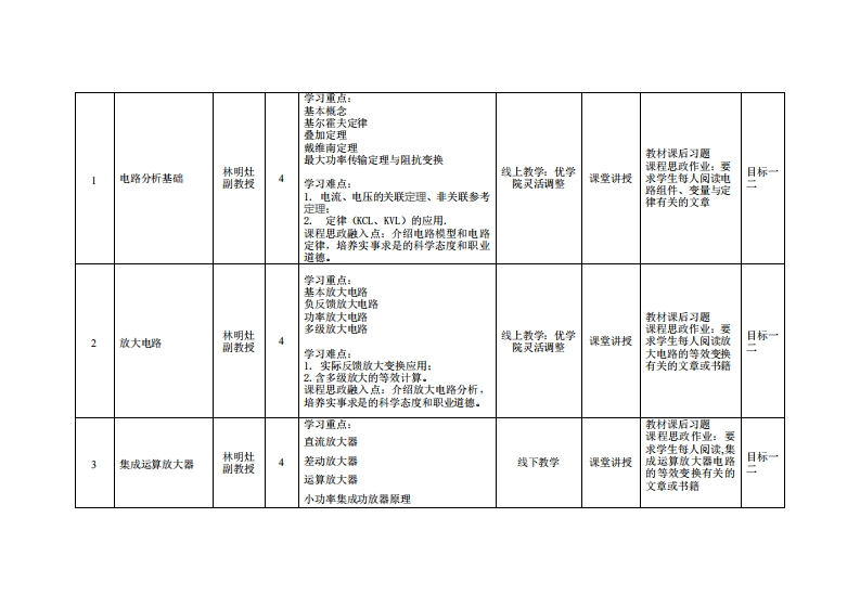 《电工电子技术》教学大纲课避名称,电工电子妆术课类别(必修选修):专业必修课课程英文名称:Electrical and electronic technology总学时周学时学分,644其中实验实艘学时:24先修课是:基池电学后续课程支推授课时间:1至16周里期一1-2节。■期三12节授课地点:6407课对津:2021智能制造工程1班开裸学洗:粤台产业科技学院任课就姓名淋:林明灶/副教授答展时间、地点与方式:1每次课的课前、课间和课后,采用一对一的问答方式:2每次习题课,采用集中讲解方式。课狸考楼方式:开卷(√)闭卷()课程论文()其它(√)使用微村:《模拟电路与数字电路》,寇戈主编,电子工业出版社,1SBN9787121365942课程情介:《电工与电子技术》介绍模拟电路、数字电路和电力电子电路,主要内容有电路分析基础、放大电路、集成运算放大器、电源电路、数字电路基础与门电路、数编码与逻辑代数、组合逻辑电路、时序逻辑电路、脉冲电路、A1D模/数)和DA(数/模转换电路、控制技术、交流调压电路、交变变频电路。本课程是后续一些专业课程诸如地子技术、自动控制等课程,为一门极重要的理论性课程,它的教学目的是培养学生具有电路学的专业知识,以及应用这些知识进行各种地路的分析方法的能力.