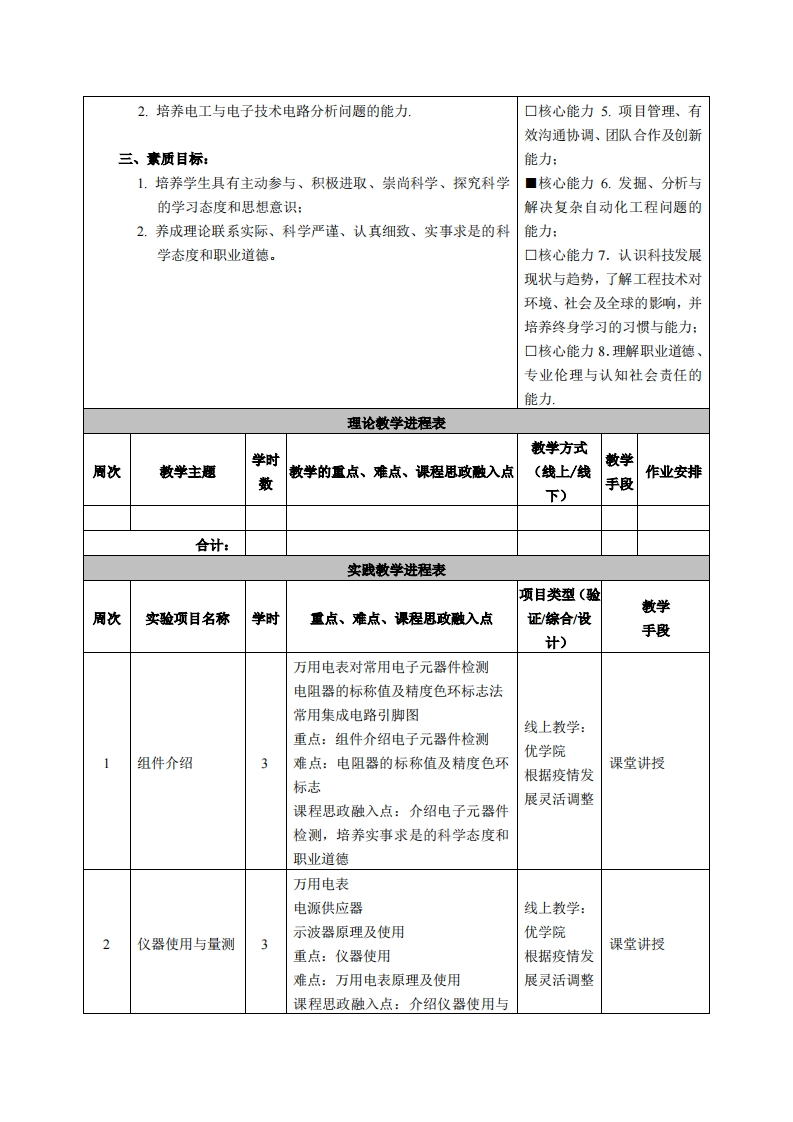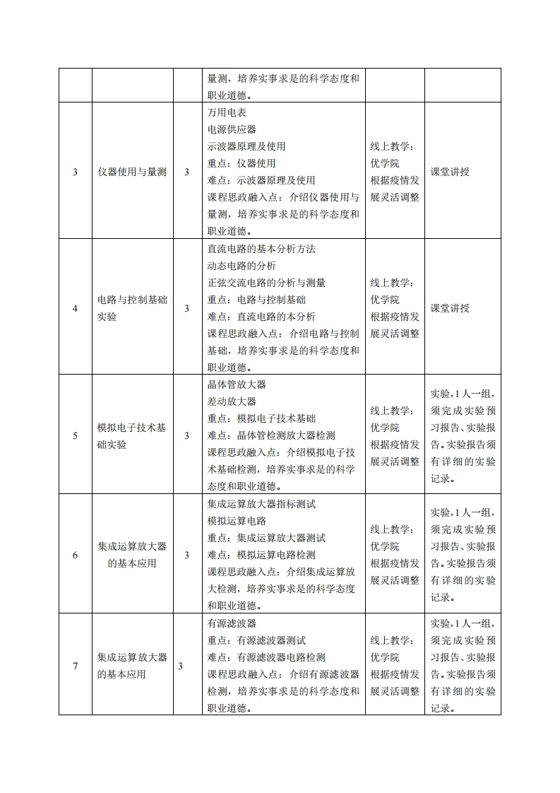 《电机实习》课程教学大纲课程名称:电机实习课程类别(必修选修):任选课课程英文名称:Electric Machinery Practice总学时周学时学分:48/3/3其中实验/实践学时:48先修课程:无授课时间:1-16周周xx-x节授课地点:机电楼201授课对缘:2018级自动化1班开课学院:粤台产业科技学院任课教师姓名职称:林明灶/副教授答疑时间、地点与方式:1每次课的课前、课间和课后,采用一对一的问答方式:2.每次习题课,采用集中讲解方式。课程考核方式:开卷()闭卷()课程论文()其它(√)使用教材:《电子技术实验教程》(第2版,普通高等教育“十二五”电工电子基础课程规划教材),作者:于海雁主编出版社:机械工业出版社出版时间:2014年09月。SBN:9787111477488教学参考资料:1.各精品资源共享课网站。线上:优学院课程简介:《本课程学习内容为电子技术实验,授课内容含常用电子仪器的使用,直流稳压电源,电压放大器,差动放大器,集成运算放大器,集成运算放大器的应用,振荡器,整流电路,数字电子技术实验课程教学目标本实践环节与学生核心能力一、知识目标:培养之间的关联(授课对象为1、了解实验基本要求、电路的连接及故障处理,并学习对于理工科专业学生的课程填写实验数据纪录的分析与处理。此栏):2、运用电路学的基本知识,了解电路的基本概念、相关理论、■核心能力1.掌握从事自动定理,并以实验建立电路模型,用以验证理论的真实性。化领域所需数学和基础科学3、利用实验,将理论与实际应用结合起来,通过虚拟实验以知识:及验证性、综合性、设计性和研究性等多层次实验来提高■核心能力2.对自动化系统学生的动手能力。或产品的技术进行分析、解释4.本课程学习电工与电子技术,重在实习,注重动手、加相关数据及独立设计的能力:强实践、培养兴趣和激励创新。实验层次包括验证性实验、■核心能力3.掌握自动化专综合性实验、设计性试验和创新性实验,以适应新形势下业中“信息、控制和系统”的基电工与电子技术教学,使得本课程学习达成先进性和实用本原理及应用方法,了解自动性目标。化领域的前沿和发展动态:二、能力目标:■核心能力4.具有创新意识1.培养学生(1)电路学的基本知识,(2)实验建立电路模和自动化新产品、新设备进行型分析问题的能力。开发和设计的能力: