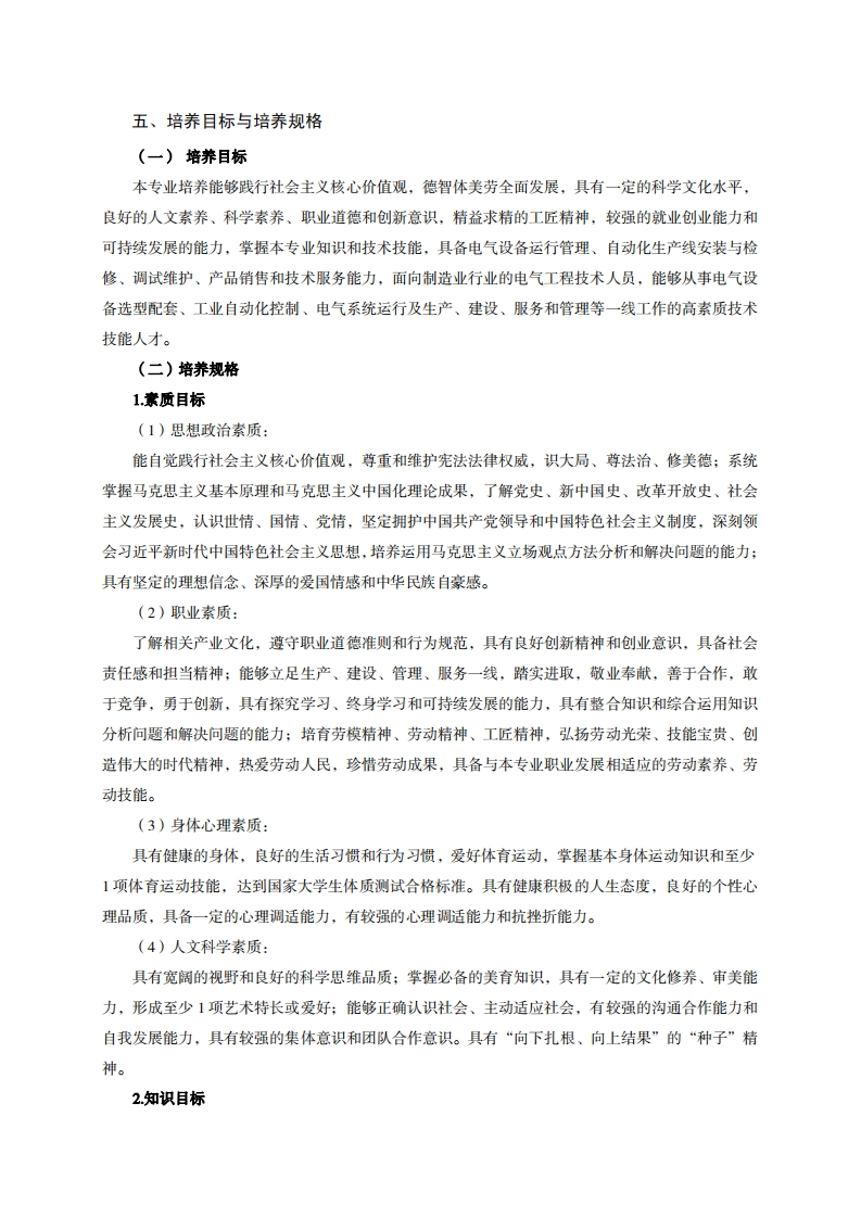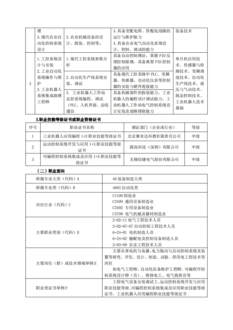 《电气自动化技术》专业人才培养方案一、专业名称及代码专业名称:电气自动化技术专业代码:460306二、入学要求招生对象:高中(中职)毕业生或具有同等学力者。招生类型:文理兼收。三、修业年限三年。四、职业面向(一)职业能力分析1.专业服务面向本专业面向机电及制造类大中型企事业单位,主要从事电力拖动、自动化控制系统、自动化生产线及现代农业自动化设备的电气系统运行、设备维护、安装及调试,还可从事厂矿和楼宇供配电、居民区、商业区域供电系统的设计、运行维护及安全管理等工作。2职业岗位与职业能力分析序号工作岗位典型工作任务职业能力支撑课程1.电气控制系统安装调1.具备电气图的识图及绘图能力电工基础与测试2.具备低压电器的选型配套能力量、机电工程1.电气控制系2.电气控制系统运行维3.具有电气控制柜布局、安装和CAD、电机与电气统设计与调试护布线的能力控制、PLC应用技2.电气系统运4.具备传统电气控制系统主电路术、应用英语、及控制电路的设计及运行与维护1行与维护3.传统电气控制系统设劳动、社会科学3.电气设备安的能力计及改造基础、文明礼仪、装、调试、维5.具备常规电气控制系统功能改企业文化、创新护、维修,生造及故障排除能力创业、社会实践、产及销售管理公共关系、写作4.具有沟通能力、团队协作能力、3.产品销售及售后服务与沟通、信息处创新能力理技术1.供配电系统1.供配电系统的继电保1.具备工厂供配电系统一次、二工厂供配电技设计与安装护次回路的设计能力术、电气运行技c22.工厂供配电2.工厂变电所二次回路2.具备工厂供配电系统安装与检术与管理、电气系统运行与管的设计修的能力试验、现代农业