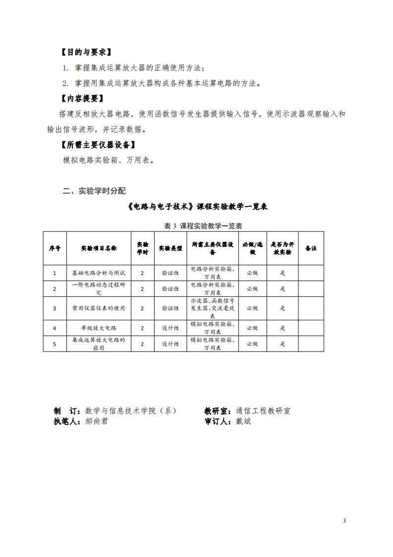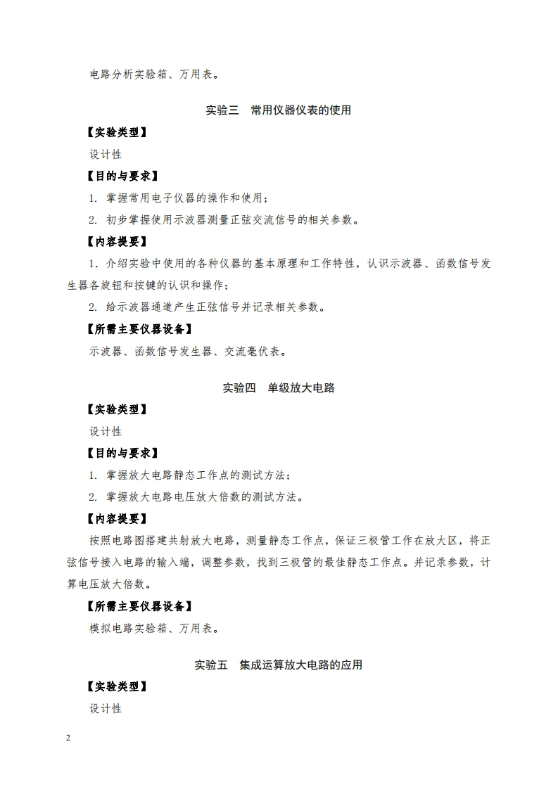 《电路与电子技术》实验教学大纲一、实验教学内容及要求实验一基础电路分析与测试【实验类型】验证性【目的与要求】1.学会识别常用电路元件的方法;2.掌握线性电阻、非线性电阻元件伏安特性的测绘;3.掌握实验台上直流电工仪表和设备的使用方法。【内容提要】1.筒述电路元件的基本理论,包括欧姆定律、基尔霍夫定律等,并解释伏安特性曲线的意义。2.测量线性电阻、非线性电阻元件的伏安特性,记录每次测量得到的电压和电流值,根据这些数据绘制伏安特性曲线。【所需主要仪器设备】电路分析实验箱、万用表。实验二一阶电路动态过程研究【实验类型】验证性【目的与要求】1.加深对电容器储能性质的理解:2.研究电容充放电的条件、过程以及时间常数与电路参数R、C的关系。【内容提要】1.按照电路图搭建RC电路,使用万用表观察并记录电容充放电两端电压的变化,记录电容充电和放电时电压随时间的变化:2.根据实验数据计算时间常数(T=RC)。【所需主要仪器设备】
