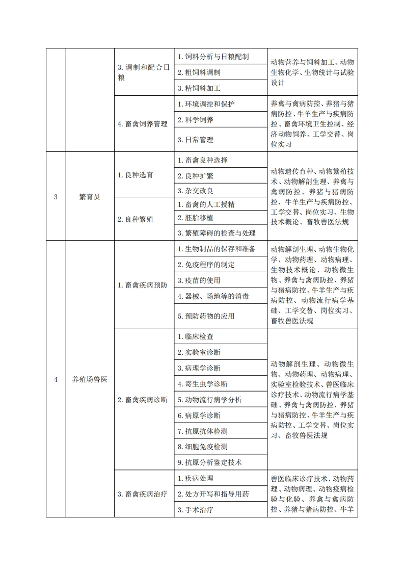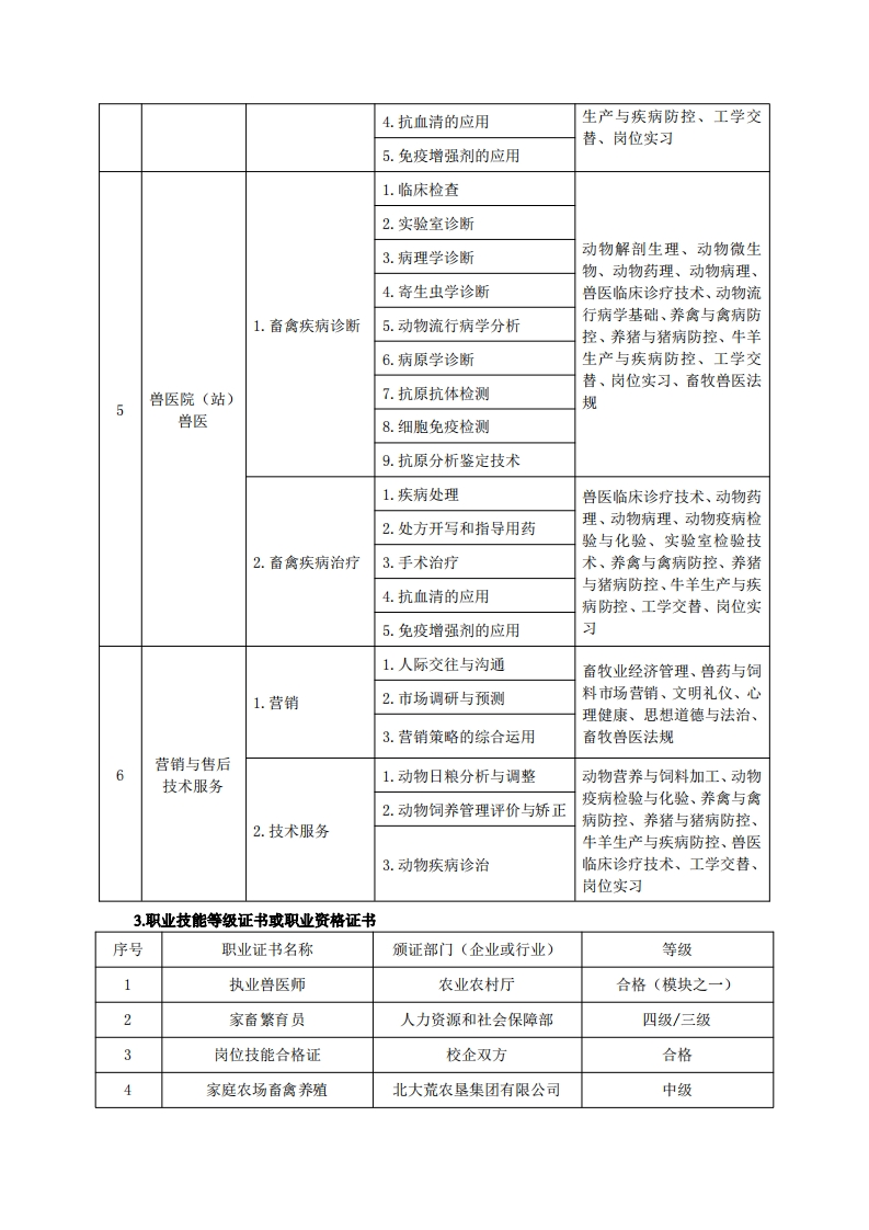 《畜牧兽医》专业人才培养方案一、专业名称及代码专业名称:畜牧兽医专业代码:410303二、入学要求招生对象:高中(中职)毕业生或具有同等学力者。招生类型:文理兼收。三、修业年限三年。四、职业面向(一)职业能力分析1.专业服务面向毕业生主要面向大型现代化畜禽养殖场、畜牧兽医技术推广部门、饲料厂、兽药厂、动物医院、动物疫病防控部门等企事业单位就业或自主创业,从事畜牧业生产经营、动物疾病防控、畜牧产品营销、技术推广及管理工作。适应的岗位群:①畜禽养殖;②畜禽繁育:③畜禽疾病防控:④饲料生产与营销:⑤畜牧场设备使用与维护:⑥畜牧企业经营与管理:⑦宿牧场废弃物资源化利用:⑧动物药品的管理与营销:⑨动物及动物产品的检验检疫;①畜产品加工。2.职业岗位与职业能力分析序号工作岗位典型工作任务职业能力支撑课程1.生产指标制定与考核1.牧场技术管理2.制定岗位操作规范畜禽环境卫生控制、养禽与禽病防控、养猪与猪病防3.生产计划制定与调整控、牛羊生产与疾病防控、牧场管理1.牧场人员管理与培训畜牧业经济管理、生物统计与试验设计、工学交替、岗2.绩效管理位实习、写作与沟通、应用2.牧场经营管理英语、牧场信息化管理技术3.物品管理及大数据处理、企业文化4.财务管理1.选种、引种和1.种用畜禽的鉴定、鉴别动物解剖生理、动物遗传育良种推广种、动物繁殖技术、生物技养殖场22.利用良种进行杂交改良术概论养殖技术员2.建设或改建畜1.规模化养殖场的论证、畜禽环境卫生控制、畜牧兽牧场规划、设计医法规、生物统计与试验