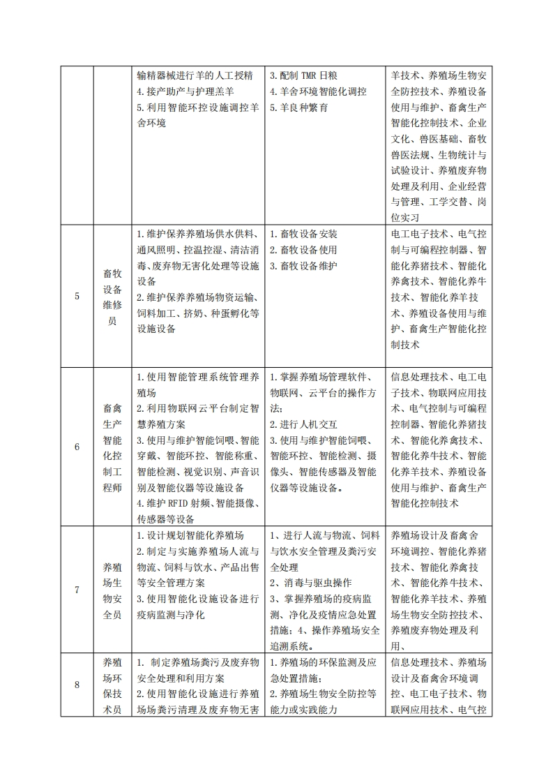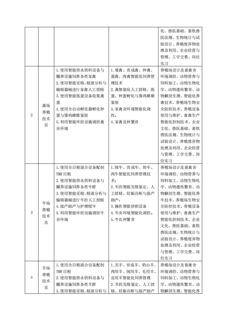 《畜禽智能化养殖》专业人才培养方案一、专业名称及代码专业名称:畜禽智能化养殖专业代码:410307二、入学要求招生对象:高中(中职)毕业生或具有同等学力者。招生类型:文理兼收。三、修业年限三年。四、职业面向(一)职业能力分析1专业服务面向要面向大型现代化畜禽养殖场、饲料厂、畜牧机械制造厂和智能养殖技术平台和技术公司就业或自主创业,从事畜禽生产、饲料加工、畜牧机械设备制造安装与维护、牧场管理软件运行、智能化养殖技术推广等岗位的生产、服务、技术管理和营销工作。适应的岗位群:①畜禽养殖;②畜禽繁育;③饲料生产与营销;④畜牧企业经营与管理;⑤畜牧机械的制造、安装、使用、维护和营销;⑥畜禽智能管理系统的操作、维护和营销;⑦畜产品加工2职业岗位与职业能力分析工作序号典型工作任务描述职业能力支撑课程岗位1.使用智能供水供料设备与1.猪舍环境智能化调控养殖场设计及畜禽舍圈养设施饲养各阶段猪2.种猪良种繁育环境调控、动物营养与2.使用智能采精、精液分析与3.仔猪、育肥猪和种猪等饲料加工、动物生物化输精器械进行猪的人工授精智能饲喂管理学、动物遗传繁育、动猪场3.使用B超进行妊娠诊断4.猪场养殖设备维护物解剖生理、电工电子养殖4.利用智能环控设施调控猪5.猪智能化饲养管理技术、物联网应用技技术舍环境6.猪场生物安全防控术、电气控制与可编程员5.使用智能化设施进行猪场控制器、智能化养猪技粪污清理及废弃物无害化处术、养殖场生物安全防理控技术、养殖设备使用6.种猪选育技术与维护、畜禽生产智能化控制技术、企业文