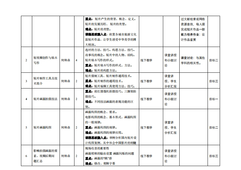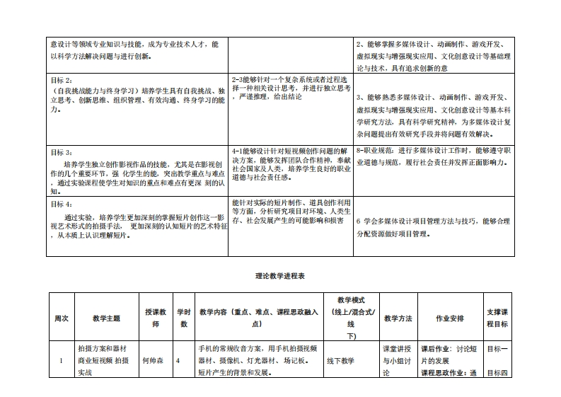 《短视频创作》教学大纲课程名称:短视创作课程类别(必修选修),经修裸程英文名幕:近crof11 aCreation总学时周学时学分:324/2其中安验/实线学时:16/0先修课是:振盖确、影律后制处速实务后镇课安排年遗拟现实与增实境、华业设计授课时间,916周周一5-8节授裸地点:机电接303机房提课对缘:22领$蝶体1斑开裸学陕:粤合产业科故学洗任裸敏甲姓名/豫:何帅森/耐微授客时间、地点与方式种定,每调三、四全天课程考核方式,开卷()阳卷()课盘论文()其它(V)使用材:恒视创作实录与妆程李半宁输清华大学出版社,。2022妆学考资料:董丛常整连.短视创作,北京:中口传大学出版社,2020课程情介:《短视频创作》是高等院校多媒体设计专业开设的一门重委的专业必修课,本课程绕着短视频拍摄、短视频剧本写作、故结构与拍摄练习、制片筹备与机位设计、构图与场景、开机前的准备与剧本细节、视频后期技巧与实践,以及进学习方法等,涵盖剧本写作、镜头组接、机位设计、分镜表制作、拉片等实用技巧,并以多部短视频为例,解析短视频创作全流程。等核心内容展开教学,并巧妙融入思政案例的分析与解读,思政主题的作业拍摄与点评,最终以学生小组作业的方式完成课程考核。课程微学目标及对单业2要求指标点的支排:谋程妆学目标支津卓业要求指标点毕业要求目标1:1、掌握短视频创作的基本概念、原理和、问避分析:能够应用数学、自然料学和工程科(专业基础知识与创新能力)培养学生具备多媒体设计、学的基本原理,对于多媒体设计复杂问愿进行识别方法,能够将所学知识用于解决化学领动画制作、游戏开发、虚拟现实与增强现实应用、文化创与表达,并通过文献研究分析,以获得有效结论。域复杂问题。