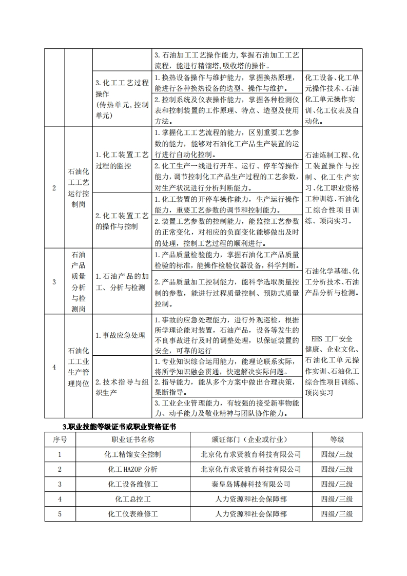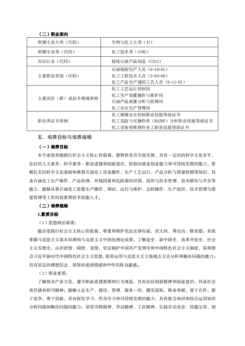 《石油化工技术》专业人才培养方案一、专业名称及代码专业名称:石油化工技术专业代码:470204二、入学要求招生对象:高中(中职)毕业生或具有同等学力者。招生类型:文理兼收。三、修业年限三年。四、职业面向(一)职业能力分析1.专业服务面向本专业主要面向石油化工生产人员等职业,石油化工装置生产现场操作、总控操作、产品检测等岗位(群)。本专业主要就业单位有:炼油、化工、能源、环保等企业及部门。主要就业岗位:石油化工生产装置操作与维护岗、石油化工工艺运行控制岗、石油产品质量分析与检测岗、石油化工工业生产管理岗位。其它就业岗位:有机化工、煤化工产品生产岗位;化工产品分析检测、反应器操作与控制岗位;化工设备使用与维护等操作岗位;化工外操现场巡检、事故应急处理、技术指导与组织生产等生产管理岗位。2.职业岗位与职业能力分析序工作岗典型工作任务职业能力号位支撑课程1.化工管路阀门安装能力,能识图、会选型、1.化工设备管路化工设备、能安装。安装,化工设备化工制图及2.化工设备维护能力,能识图,能巡回检查,使用与维护AutoCAD.石油化能进行同步、协同检修。工生产1.反应设备操作能力,能进行釜式反应器、固高分子化学、石油1装置操化床反应器、流化床反应器、管式反应器的操作与维2.化工工艺过程化学基础、化工分操作作。护岗析技术、物理化2.有机化工工艺操作能力,掌握化工生产过程(分离、反应单学、化工单元操作元)中的常用指标与催化剂,能进行催化氧化、催技术、化工装置操化加氢、芳烃转化、羰基合成等的操作及物料作与控制。衡算和热量衡算。
