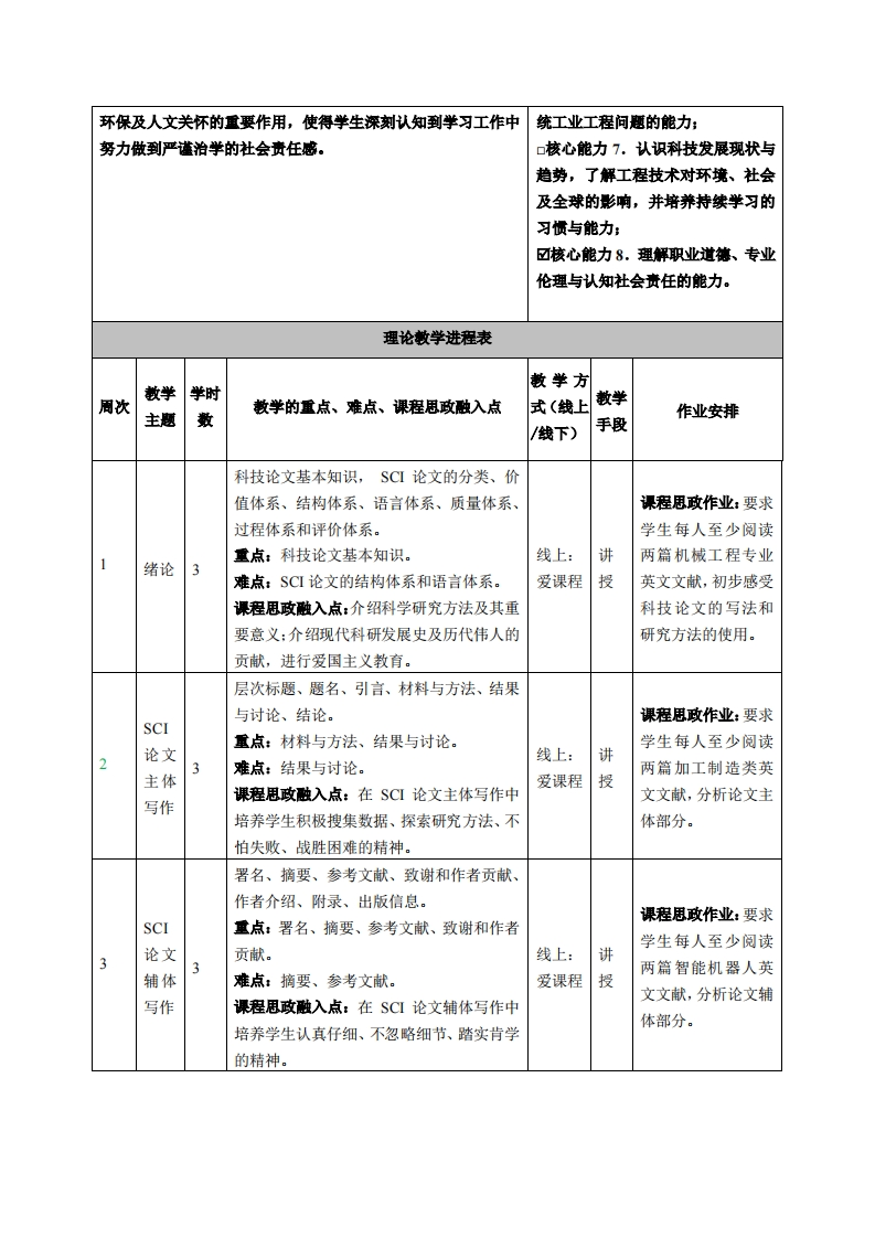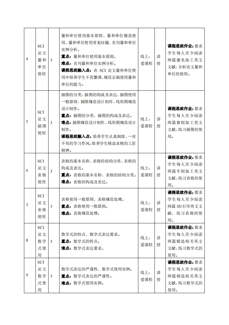 《研究方法》教学大纲课程名称:研究方法课程类别(必修选修):选修课程英文名称:Research methods总学时/周学时/学分:4833其中实验/实践学时:9先修课程:大学英语授课时间:116周授课地点:网上;粤台产业科技学院授课对象:2018精密制造1班开课学院:粤台产业科技学院任课教师姓名职称:谭华讲师答疑时间、地点与方式:1.线上:课间、网上、网络交流;2.线下:课前课间课后、教室、面授。课程考核方式:开卷()闭卷()课程论文()其它(√)上机使用教材:爱课程资源https:/ww.icourse163.org/course/UJS-1001753141?tid=1450318474,《科技创新与论文写作》教学参考资料:1.《SCI论文写作与投稿》,梁福军,机械工业出版社;2.各精品资源共享课网站。课程简介:本课程旨在多方位建立科技论文分类和SCI论文体系,探索科学的研究方法,系统讲述$CI论文的内容与结构、写作方法与步骤、写作规则与技巧,并辅以大量实例分析和点评,有很强的针对性和实用性。涵盖科技论文分类、概念链,SCI论文体系(价值、结构、语言、质量、过程和评价六大体系),SCI论文主体写作,SCI论文轴体写作,SCI论文中量、单位、插图、表格、数学式的使用,SCI论文投稿与发表流程,国际知名投审稿系统EM(Editorial Manager)投稿流程示例。讲授本课程的主要任务是帮助本科生进行学术论文特别是英文论文的写作,同时也可为各类研究人员、硕、博士生论文写作提供参考。课堂采用线上、线下、网络、面授多元化散学模式提高专业课救学质量,为东莞理工学院坚持社会主义办学方向、培养德才兼备全面发展人才尽绵薄之力。课程教学目标本课程与学生核心能力培养之间的一、知识目标:关联授课对象为理工科专业学生的1.掌握SCI论文主体写作和SCI论文辅体写作;课程填写此栏):2.熟悉SCI论文量和单位使用、SCI论文插图使用、SCI☑核心能力1.应用数学、基础科学论文表格使用和SCI论文数学式使用等核心方法。和工业工程专业知识的能力;二、能力目标:☑核心能力2.设计与执行实验,以及1.运用逻辑思维和分析问题的能力构建不同类别SC1论分析与解释数据的能力;文框架和层次:☑核心能力3.应用工业工程领域所2.学会独自进行SCI论文投稿及各类文献编辑软件应用需技能、技术以及软硬件工具的能的能力;软件学习举一反三,做到熟练编辑,零差错。力:三、素质目标:口核心能力4.对生产系统进行规1.培养学生具有主动参与研究、积极进取学习、崇尚科学划、建模、改普、评价的能力;知识、探究科学真理的学习态度和思想意识:☑核心能力5.项目管理、有效沟通2.养成理论联系实际、科学严谨、认真细致、实事求是的协调、团队合作及创新能力;科学态度和职业道德,引导学生重视人性化的科学研究对经济、口核心能力6.发据、分析与解决系