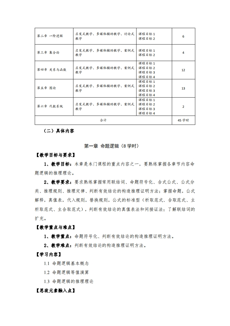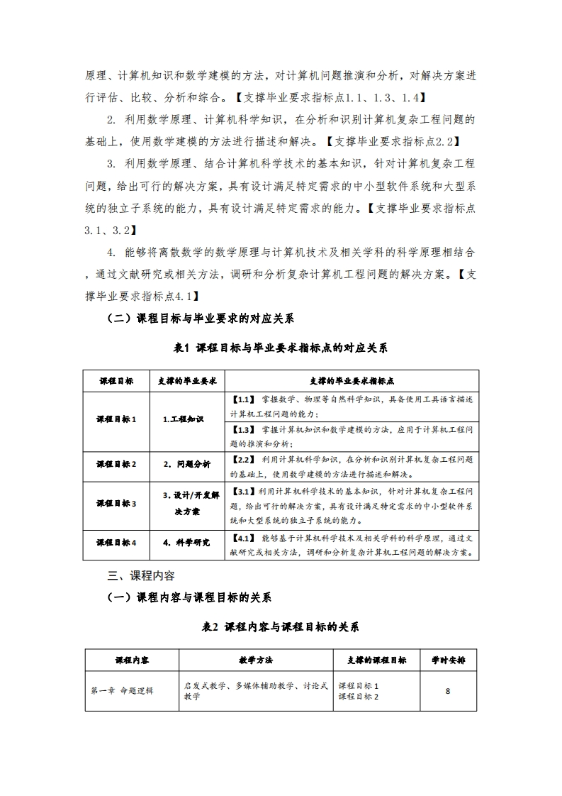 《离散结构》课程教学大纲一、课程信息课程名称:离散结构Discrete Mathematics课程代码:06E4111B课程类别:专业基础课程/必修课适用专业:计算机科学与技术课程学时:45学时课程学分:3学分修读学期:第三学期先修课程:高等数学、线性代数二、课程目标离散结构是现代数学的一个重要分支,是计算机科学与技术的理论基础。本课程是计算机科学与技术专业的学科基础课程。该课程结合计算机学科的特点,主要研究离散量结构及相互关系,是一门理论性较强,应用性较广的课程。通过本课程的学习,让学生掌握离散数学的基础知识和基本方法,能够在计算机科学、信息科学等领域中运用所学知识解决实际问题。同时,培养学生的抽象思维能力与逻辑推理能力,启发学生的思辨能力与创新精神,培养学生积极向上的学风和高尚的职业道德,为学生继续学习和工作,参加科学研究,打下坚实的数学基础。(一)具体目标通过本课程的学习,掌握离散数学的基本数学原理和推演计算方法,以及离散数学在常见的各类信息的处理以及企业信息化中的应用,能够应用离散数学的基本原理,分析和识别计算机复杂工程问题,并能使用数学建模的方法进行描述和解决。通过本课程的学习,使学生达到以下目标:1.掌握数理逻辑的基本概念和推理、演算的方法,理解群论的基本概念,理解集合论及图论的基本知识,掌握对离散对象的基本研究方法。能够运用数学