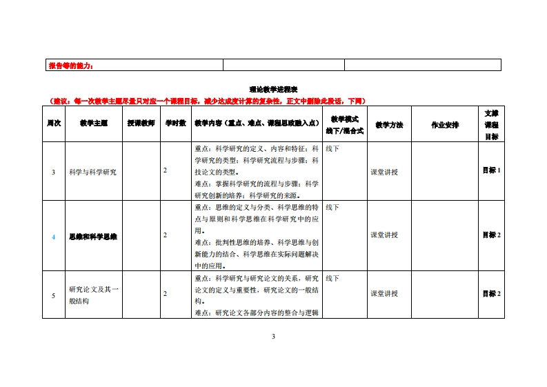 《科学思维与科学研究方法》数学大纲裸名称:科学思维与科学研究方法课和类别(必修选修):必修课程英文名称:总学时周学时学分,322/2其中实检实液学时,0先修课座:无后续课度支燥授课时间:318周星期三34节授课地点:实验楼315课对津:2024章计算机科学与技术(時孩电商)1在、2024餐计算机科学与技术(腾湾电商)2壅开裸学洗粤台产业科技学院任课就师姓名淋:潘雁软答展时间、地点与方式:周一至周五8:30-12100,1430-17:30,实验楼409,线下交流课狸考楼方式:开卷()闭卷()课程论文(√)其它()使用微村,《信惠资潭检家与利用(第2版)》,陈带,汪球,国防工业出版社,2014年:科学研究方法与学术论文可作一重论·技巧·来例(第2版)》,周新年,科学出版社,2019年妆学事考责料:《科学题唯的建论与增养),胡卫平,河北人民出版社,2023年。课避信介:本裸容甘在培养学生的修合家质和专业能力,特别性置科学思维与科学研究方法的训裤。道过本裸容的学习,学生不仅葡够从识到论文写作在大学学习过避中的重要性,更能深入速解科学研汽的本质和方法论。我们培引学生熟知论文耳作的速度和方法,并增养其灵活应用的能力。可时,裸雅将置点培并学生的文献信意检家分析能力,使其能够高激利用文献信惠资源开晨科学研究。与传统的信惠资都利用课和不同,本课和嘴调底层思维和方法论的律量。学生将学习如何运用信惠资工具,掌科学方法,遭渐学术州范,并绳开棕合运用能力以解决复杂问凰。此外,课和还将语蓝文档情可与美化故巧,使学生在学术论文耳作方面更加得心应手。本课密有利于学生挑开学习与利用信意资潭建识、政进学习与研究方法、增学习收获与效果、撒发学习动力、培养团队合作意识以及加置前置训林的学生。过本课和的学习,学生将为个四年的大学专业学习莫定坚实的基础,并为未来的学术1