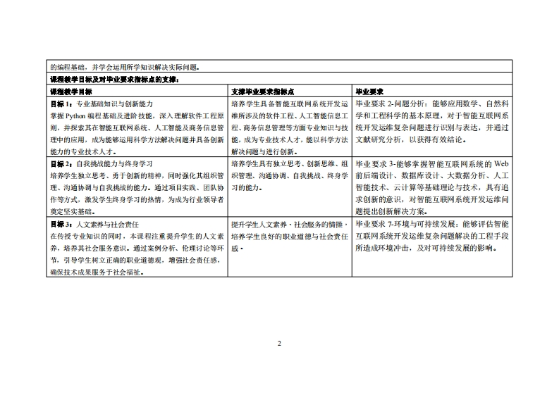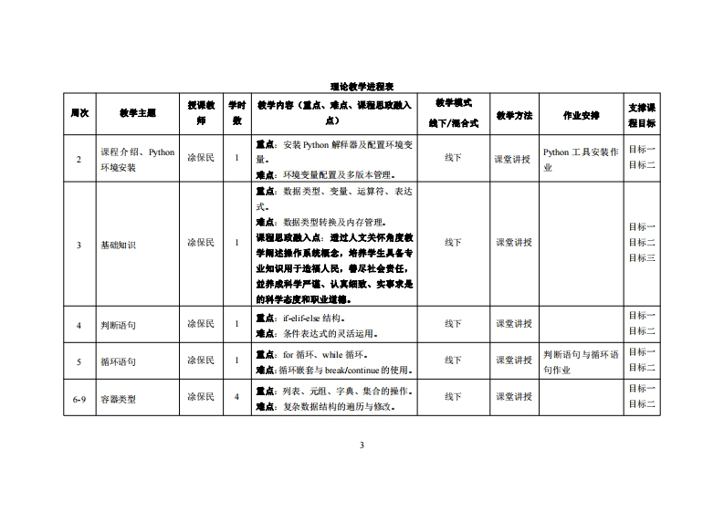 《程序设计I(Python)》教学大纲裸程名称:序设计1Pyho)课程类别(必修选修)事必修课程英文名称:Programming I(Python)总学时/周学时/学分,32/2/2其中实险实我学时:16先继课是:无后续课程支撑:程序设计Ⅱ、ava话省蓄础、Py山0n与大敢据分析、人工智能、人工智能与机器学习、Py山加网格爬虫实务授课时间:217周里期一5,6节授课地点:实验楼503提课对津:2025鞭电商1,2班开课学洗:粤台产业科技学陕任课敏柳姓名职淋:涂保民刚微授容振时间、地点与方式:课堂或裸后,批直或通讯软件,当面或线上答鞭课程考核方式:开卷()闭卷(、)课程论文()其它()使用敏材:《Python编程从入门到实践》,江红、余青松,清华大学出版社,2021年5月,1SBN:9787302572961收学◆考资料:无课程情介:本课程台在为学生提供一个全面而深入的Pym编程学习体验,从基础语法到高级特性,再到实际应用与项目开发,全方位培养学生的编程能力与创惭思维。课程以智能互联网系统开发运锥为背景,融合软件工程、人工智能信息工程及商务信息管理等多个领域的知识与技能,台在将学生培养成为具备跨学科视野的专技术人才.课程内容涵盖Pyh如环境安装与配置、基础语法与数据类型、控制结构(判断语句与循环语句)、容器类型(列表、元组、字具、集合)、函数与模块、面向对象编程、异常处理与文件操作等核心知识点。通过理论讲解、实践编程、案例分析、项目实践等多种教学方式,帮助学生逐步构建扎实
